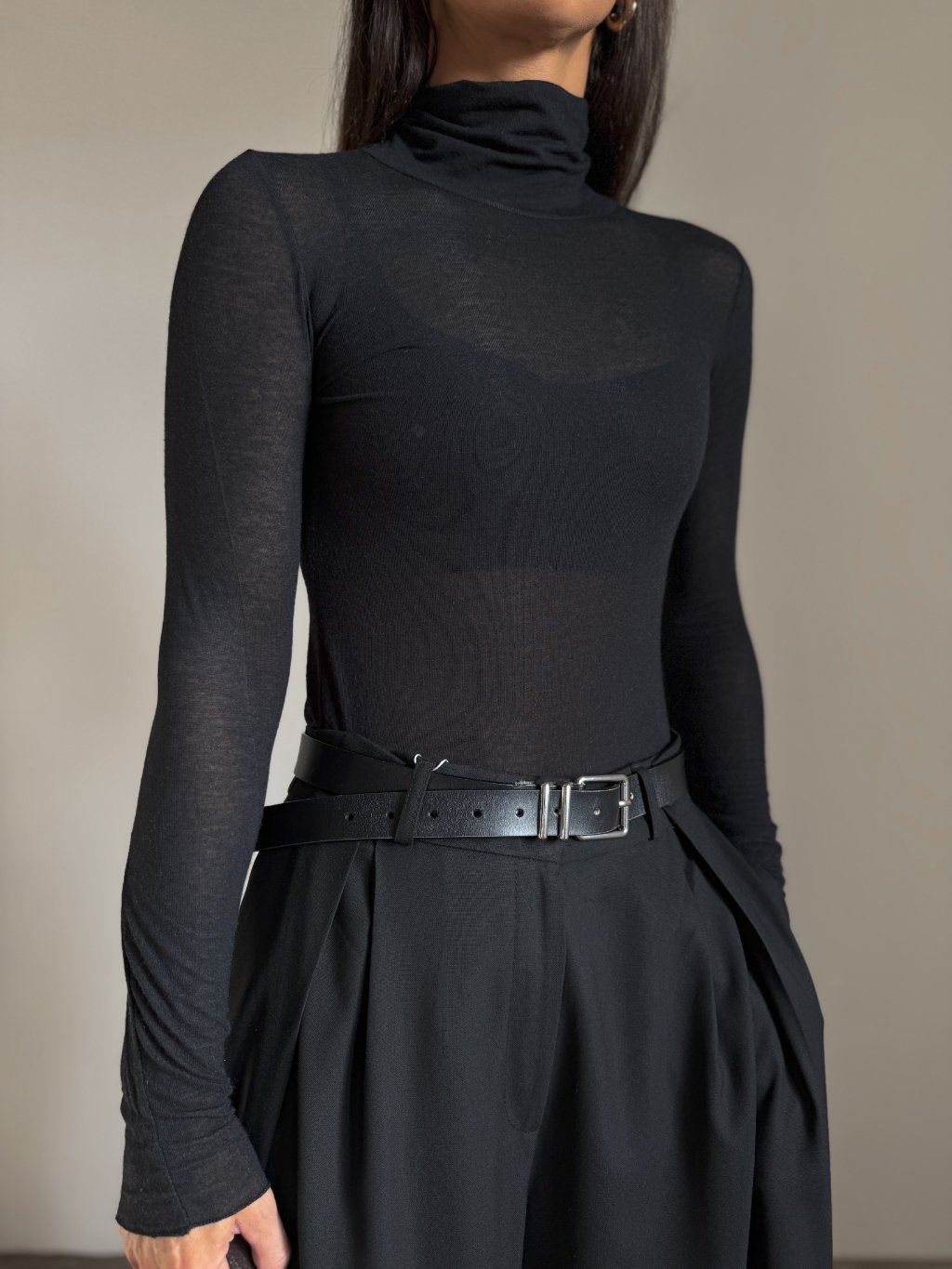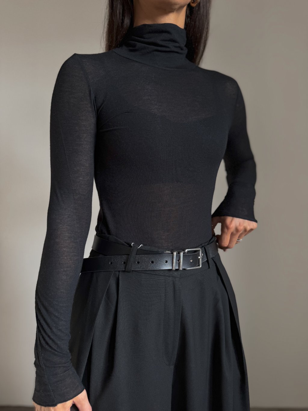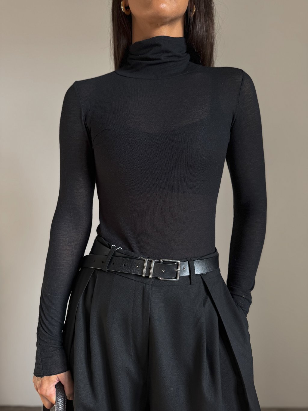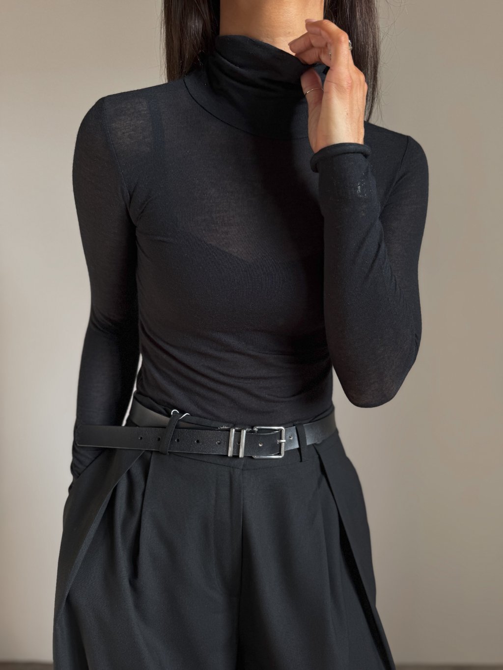 Lehký rolák, pružný, příjemný, měkký, lehce prosvítá. Přírodní materiál s elastanem a podílem kašmíru.