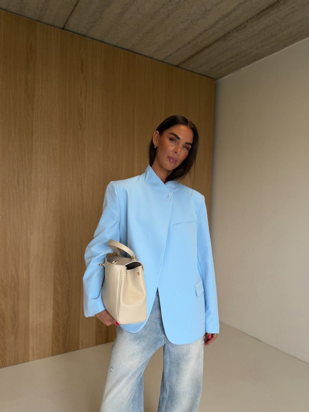Sako se stojáčkem, volnější střih, přední kapsy s klopami, jedna kapsička v oblasti prsou. Šikmo střižená přední část saka se zapínáním na jeden knoflík u krku. Ramenní vycpávky, podšívka, vzadu rozparek.