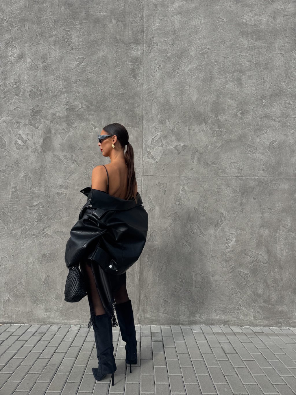 Saténové šaty, mírný áčkový a zkosený střih, tenká posuvná ramínka, na boku rozparek, horní i spodní lem je ozdoben černou krajkou.
