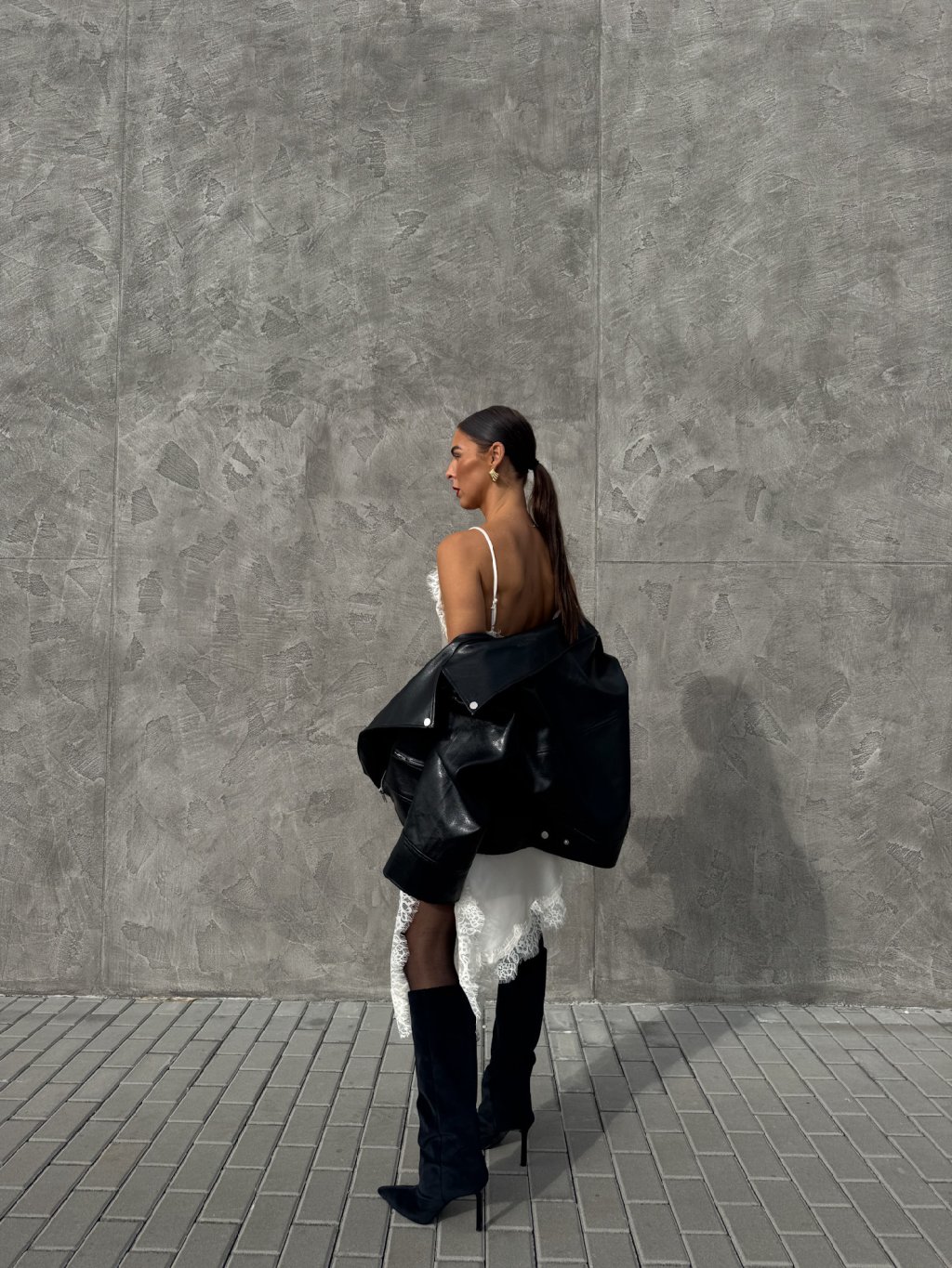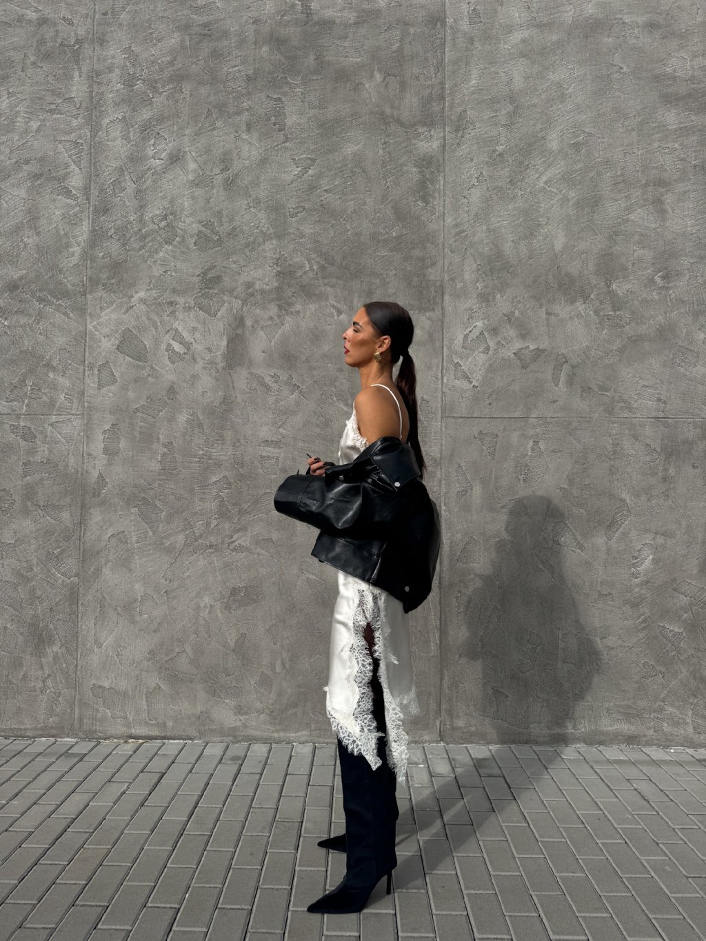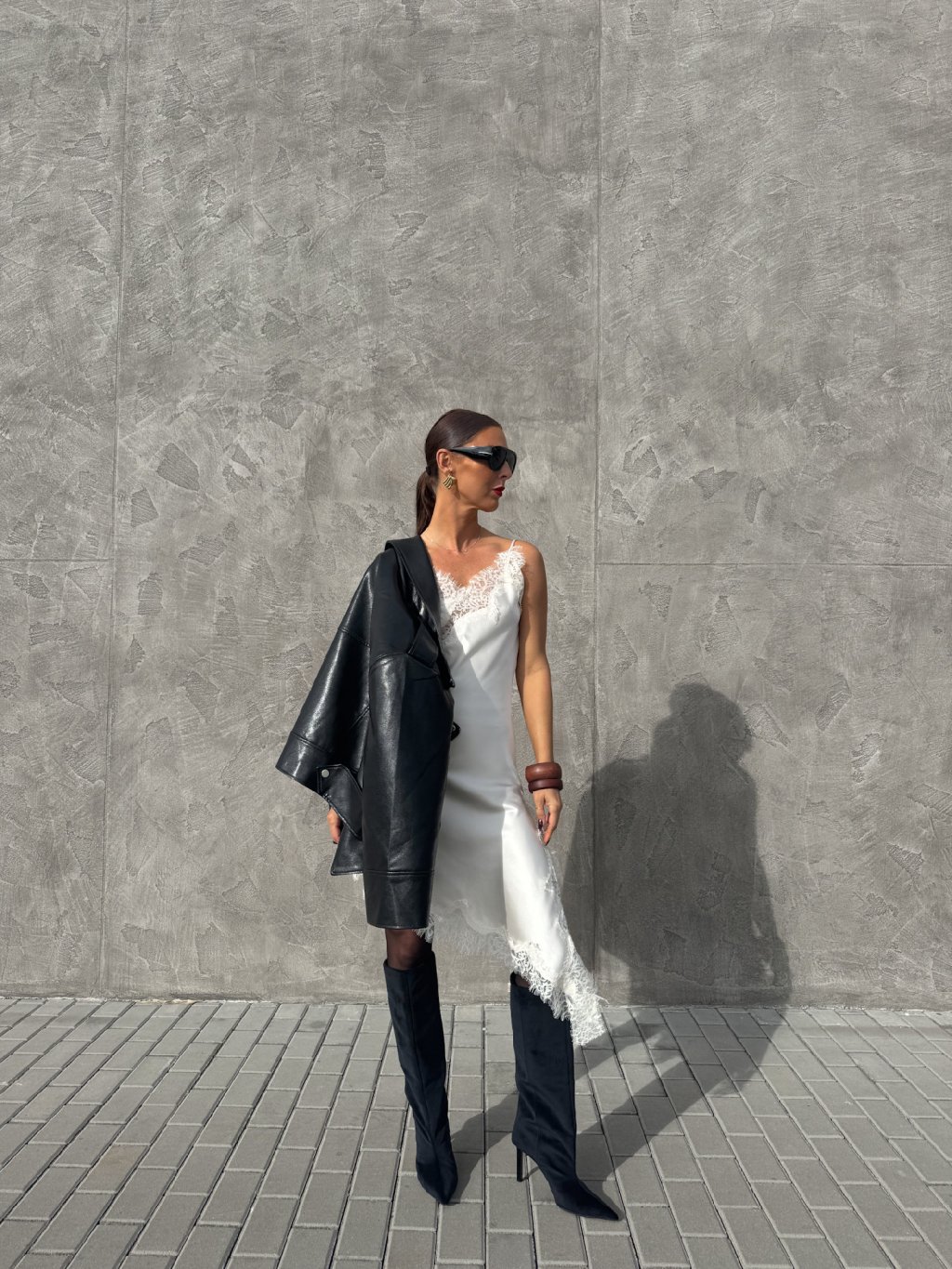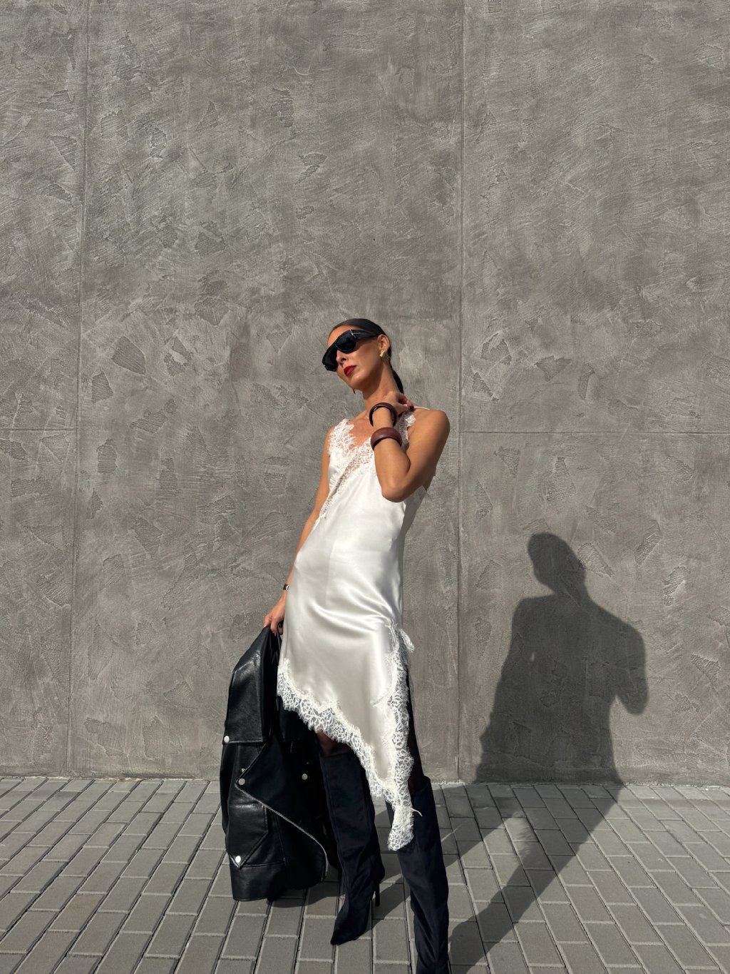 Saténové šaty, mírný áčkový a zkosený střih, tenká posuvná ramínka, na boku rozparek, horní i spodní lem je ozdoben krajkou.