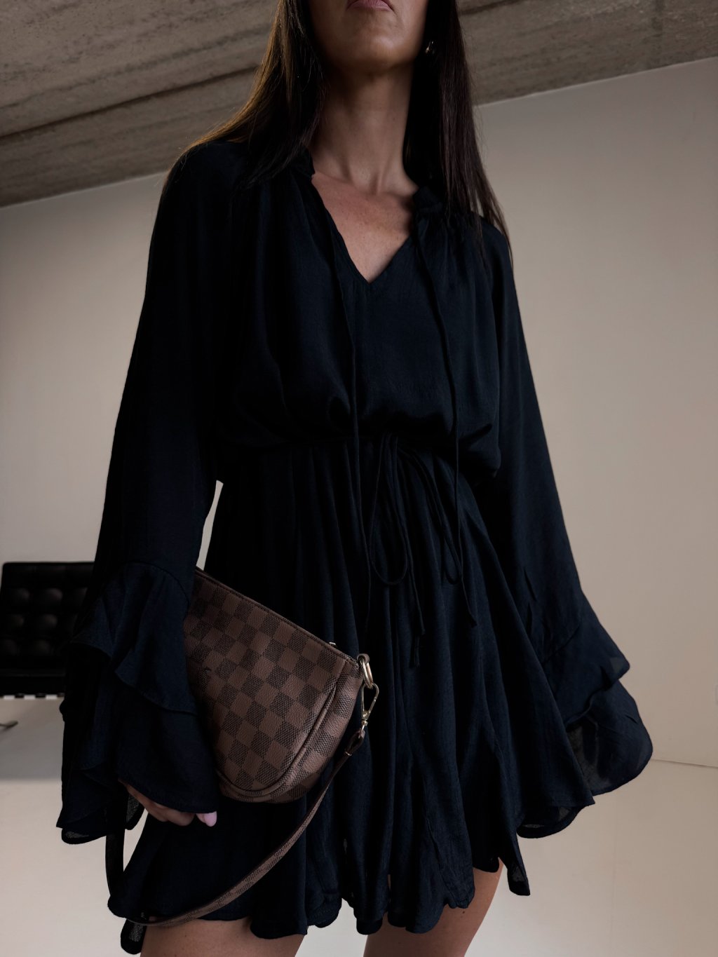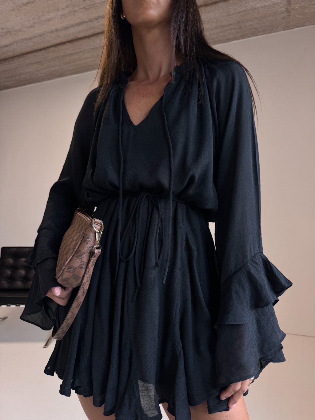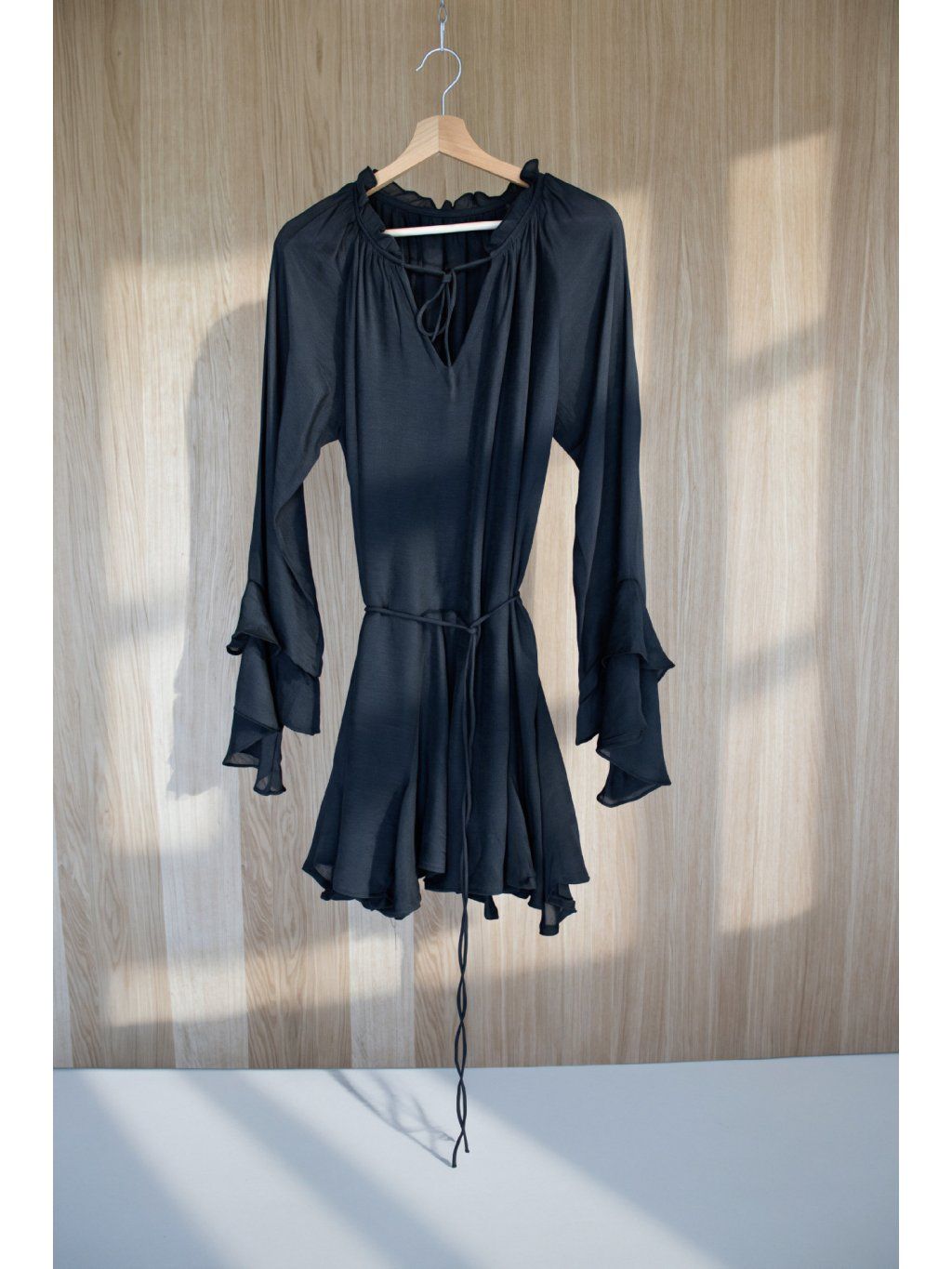 Šaty s kolovou sukní, dlouhý rukáv s volánky, rozhalenka na stažení šňůrkami. Součástí je tenký opasek.