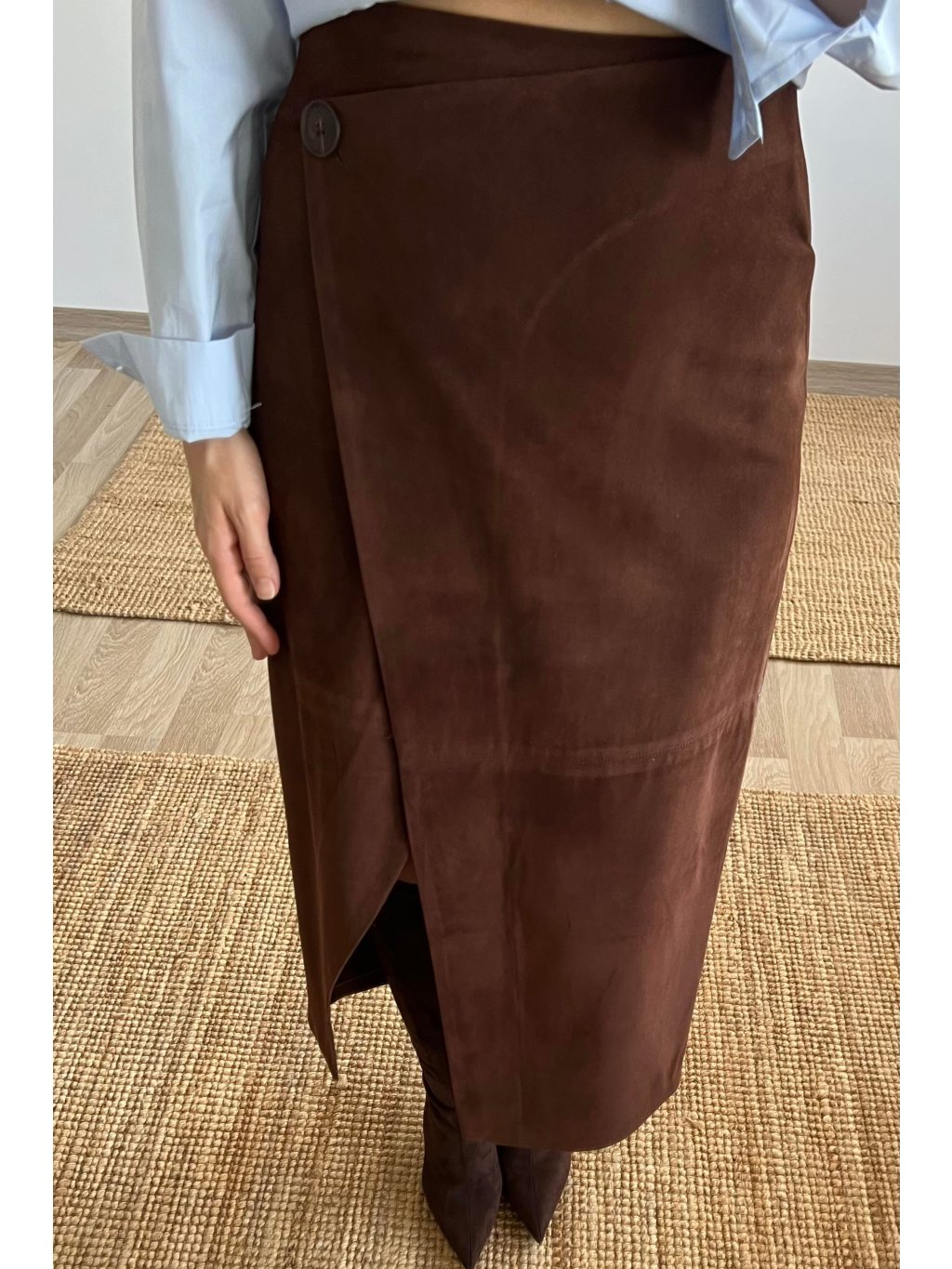 Zavinovací semišová sukně s rozparkem, midi délka, zapínání na žíhaný knoflík a na boku na zip. Pevnější materiál, drží tvar.