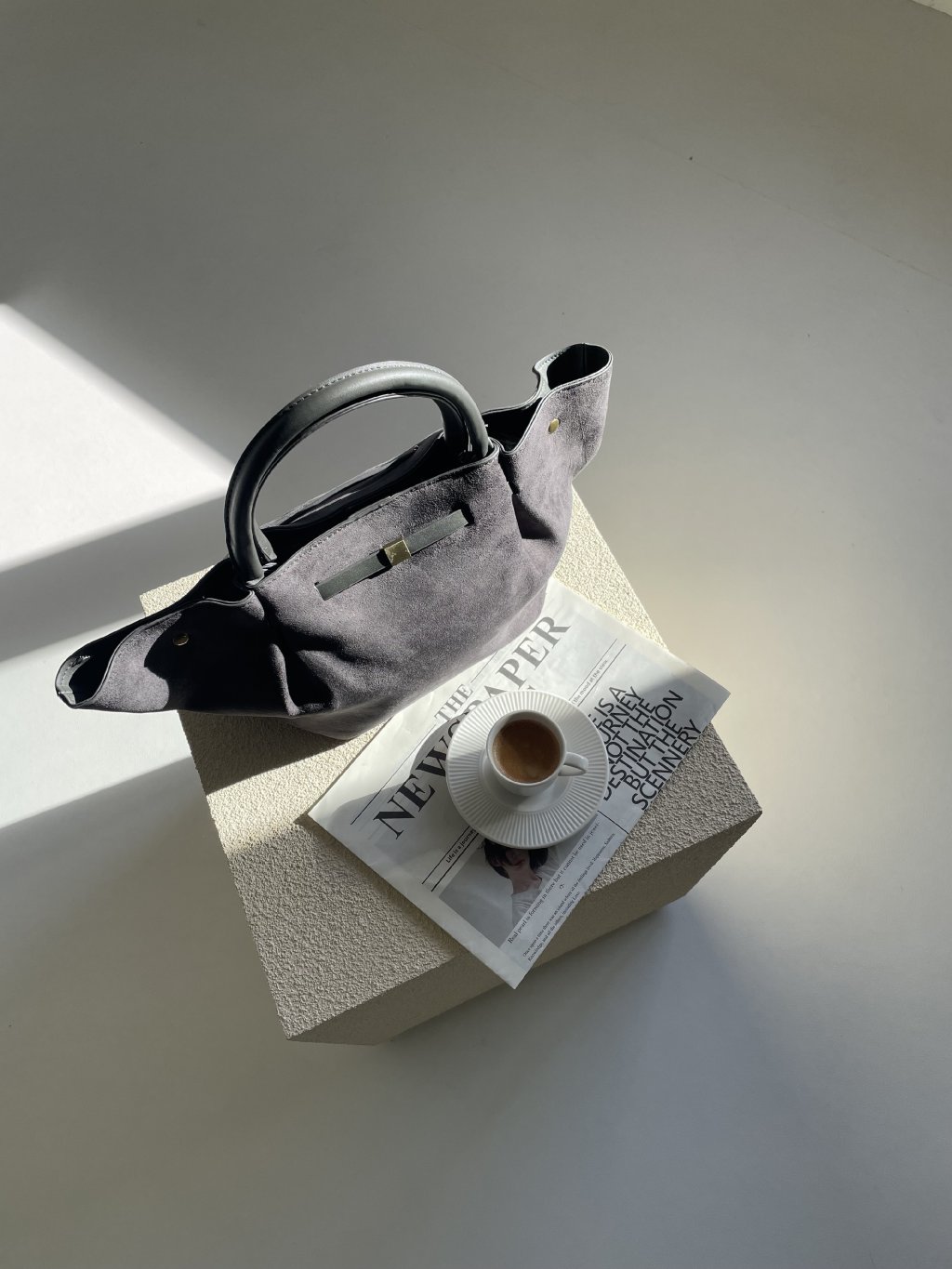 Středně velká semišová shopper bag taška, krátká ucha, zapínání na magnet a po stranách na cvoky, vpředu i vzadu detail koženkového pásku, uvnitř jedna otevřená kapsička, jedna kapsička na zip. Součástí je také úzký odnímatelný popruh. Kovové detaily na kabelce jsou ve zlaté barvě s patinou.