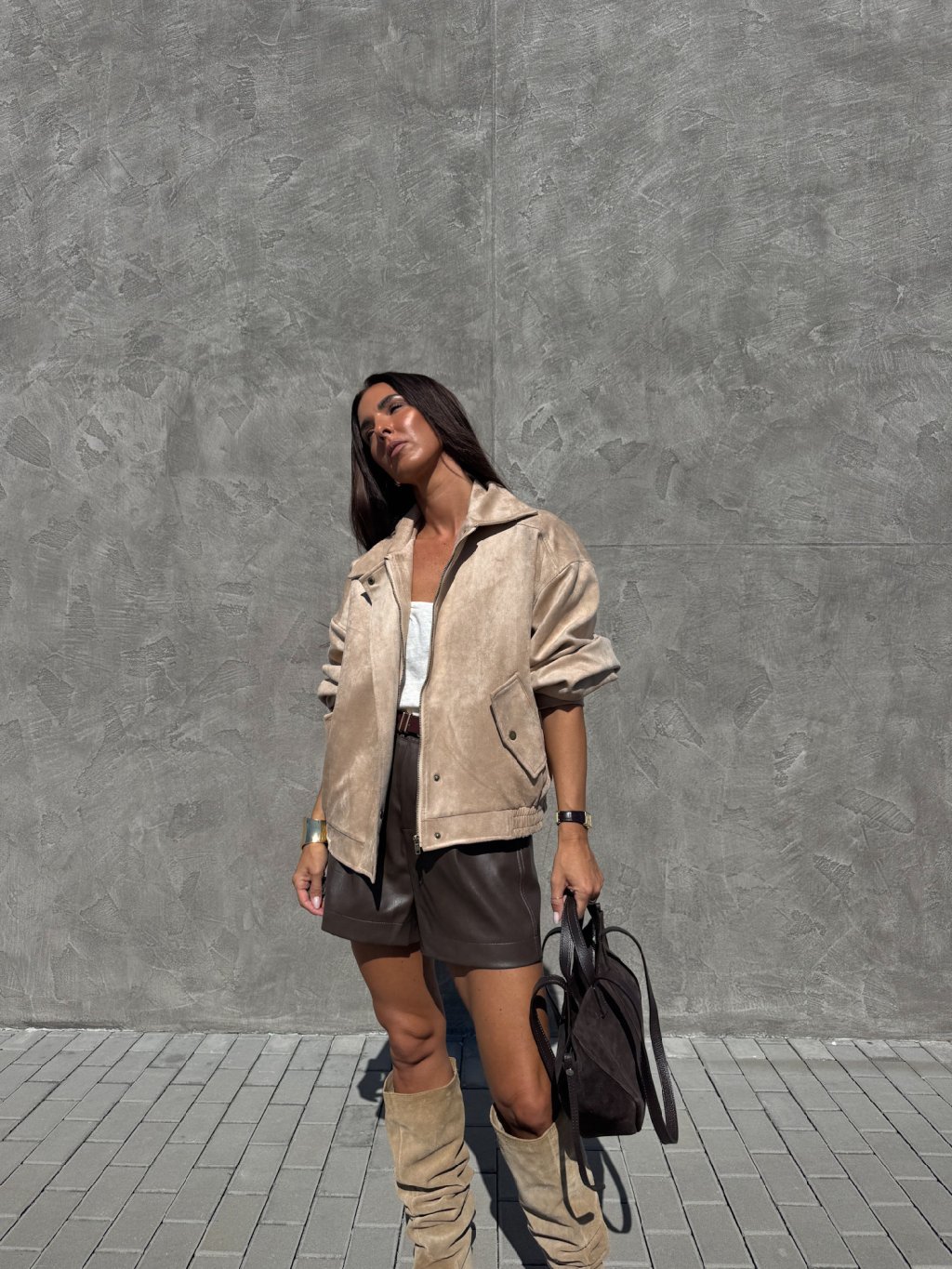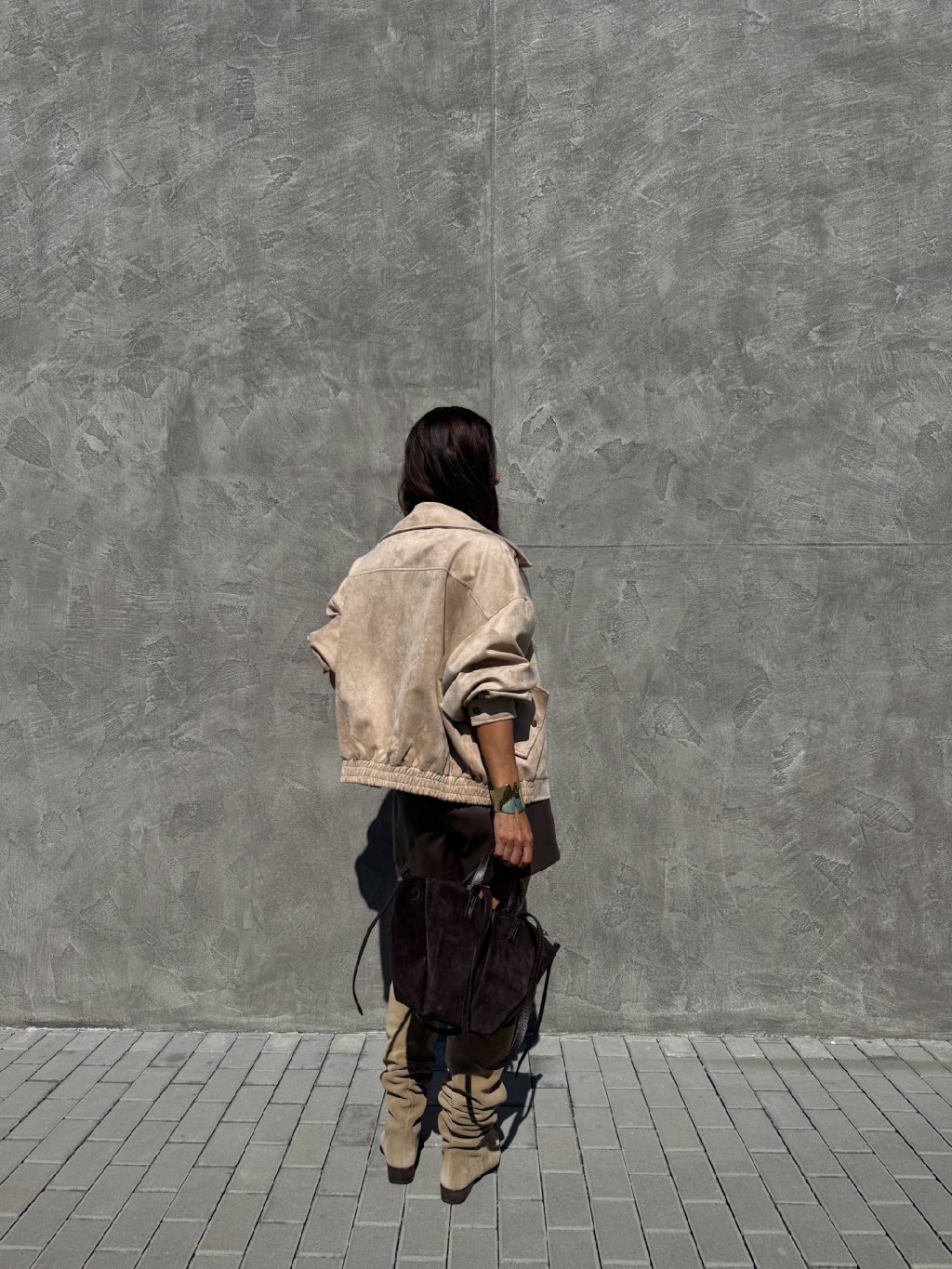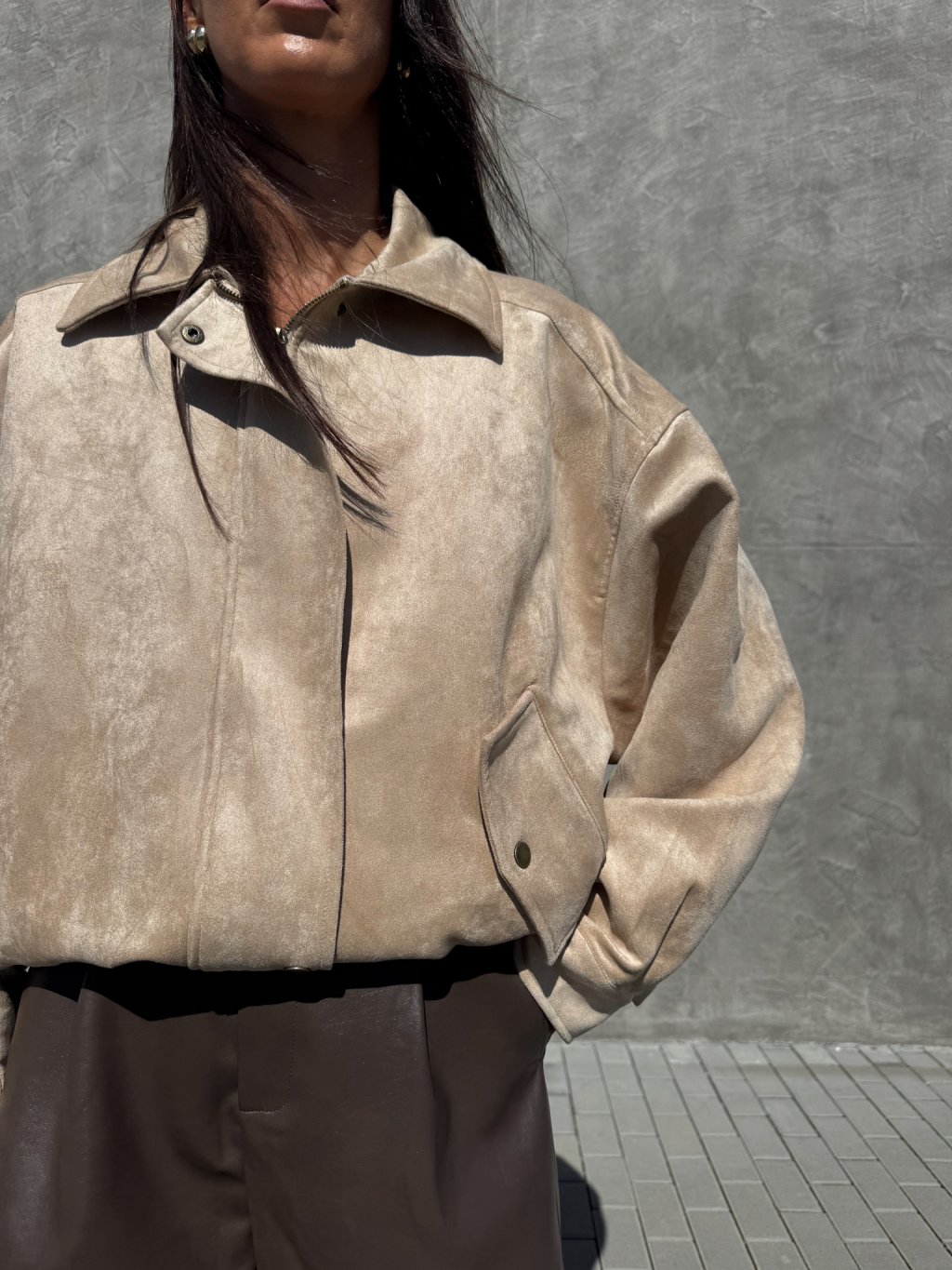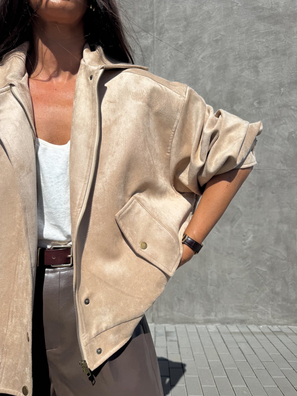 Semišový bomber, volný střih, spadená ramena, v pase stažen do gumičky, zapínání na zip a klopu s cvoky, přední kapsy také s klopou na cvok, podšívka.
