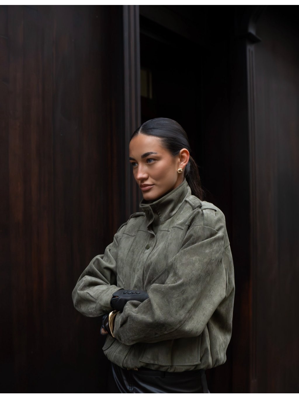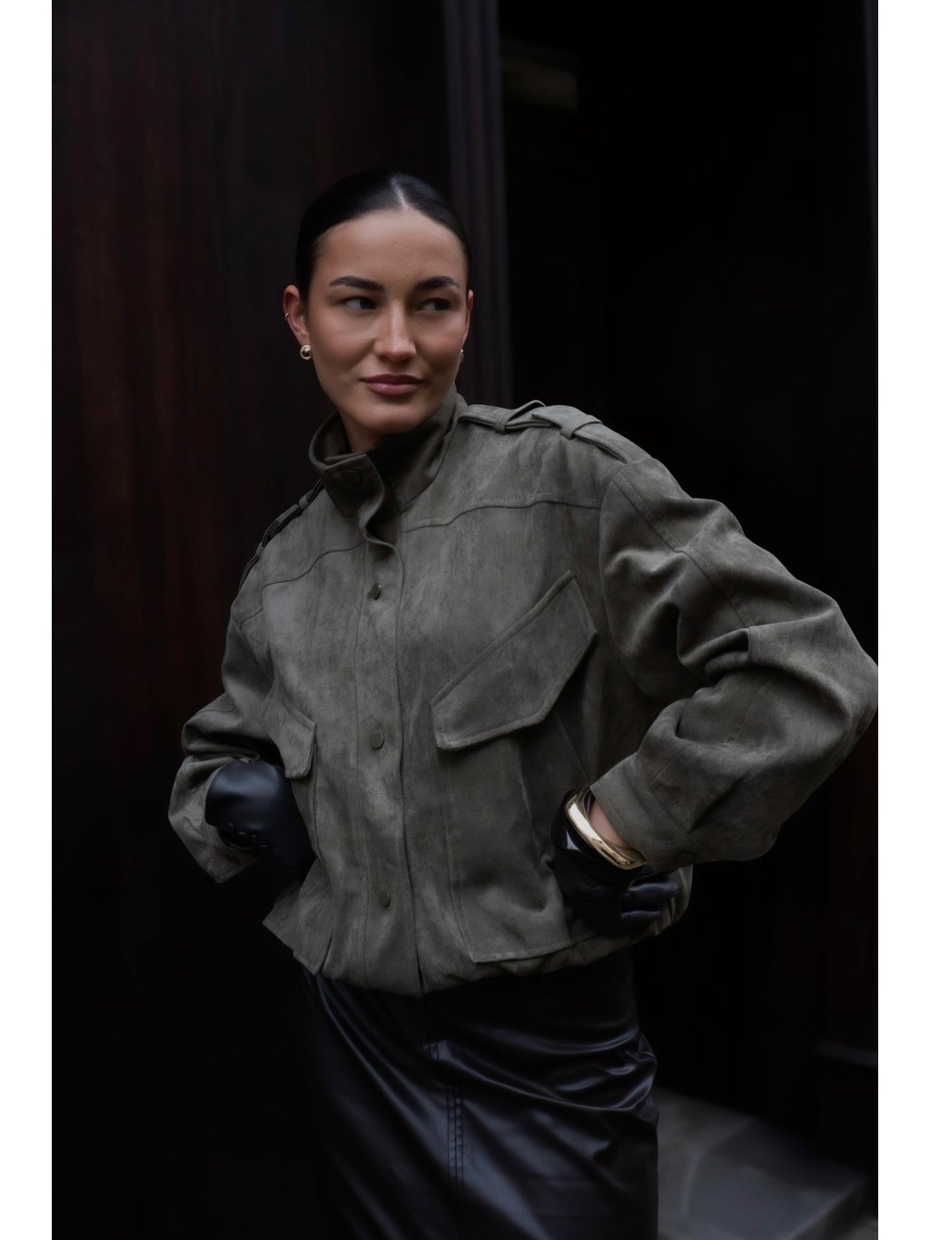 Bomber semišového vzhledu se stojáčkem, zapínání na cvoky, přední kapsy s klopami, ramenní výložky, rukávy ukončené manžetou se cvočkem, podšívka, spodní lem bomberu je do gumy. Na zádech detail krátkého štítu.