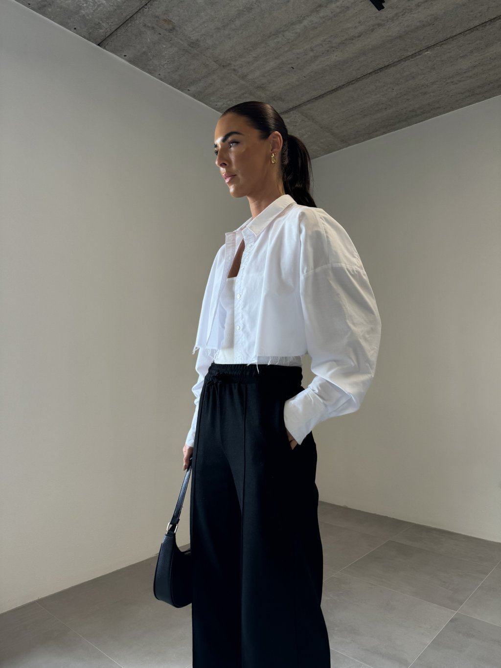 | Modelka měří 173 cm, váha 56 kg. Běžně nosí velikost S/M a oversized oblečení L. |