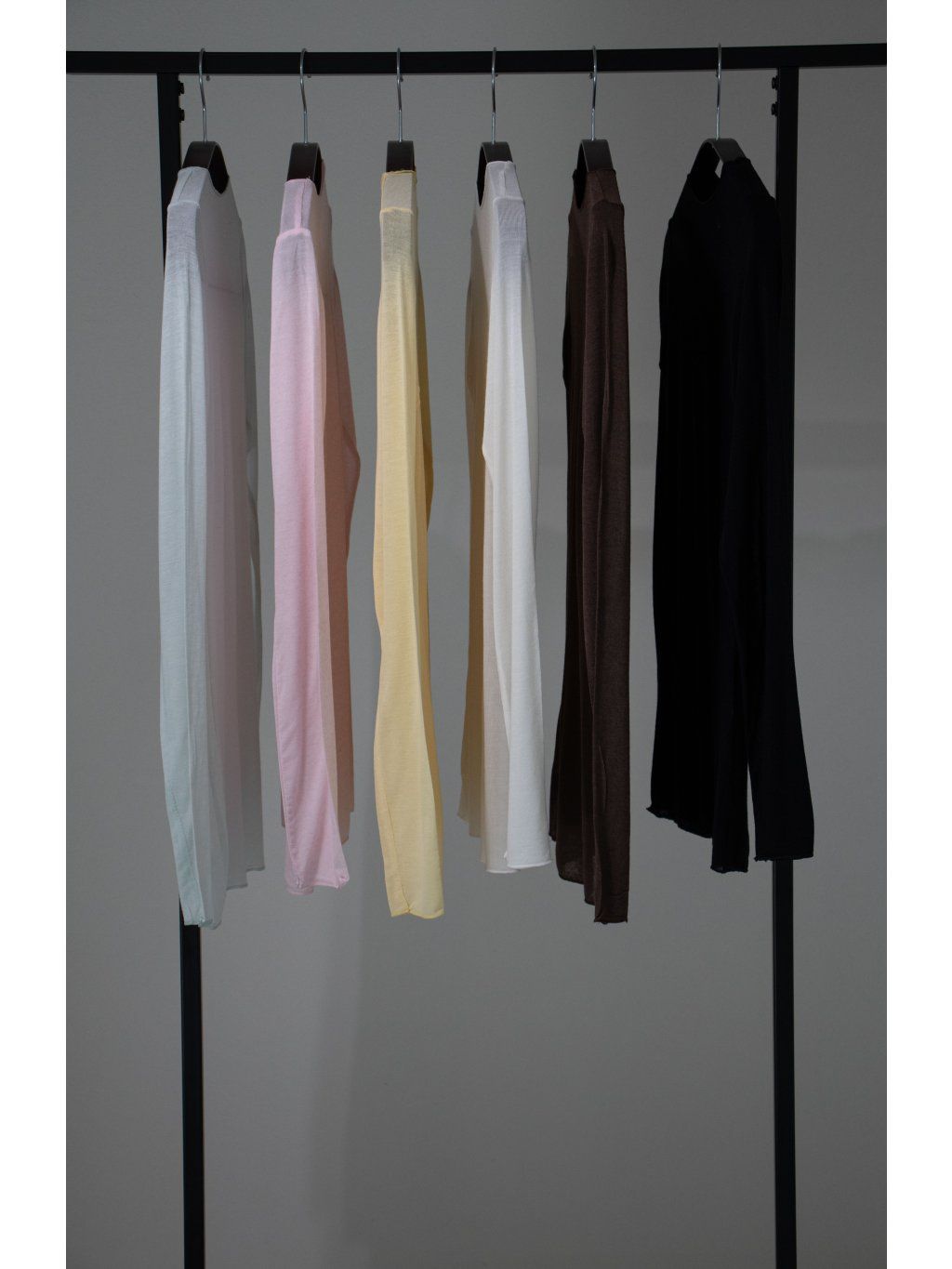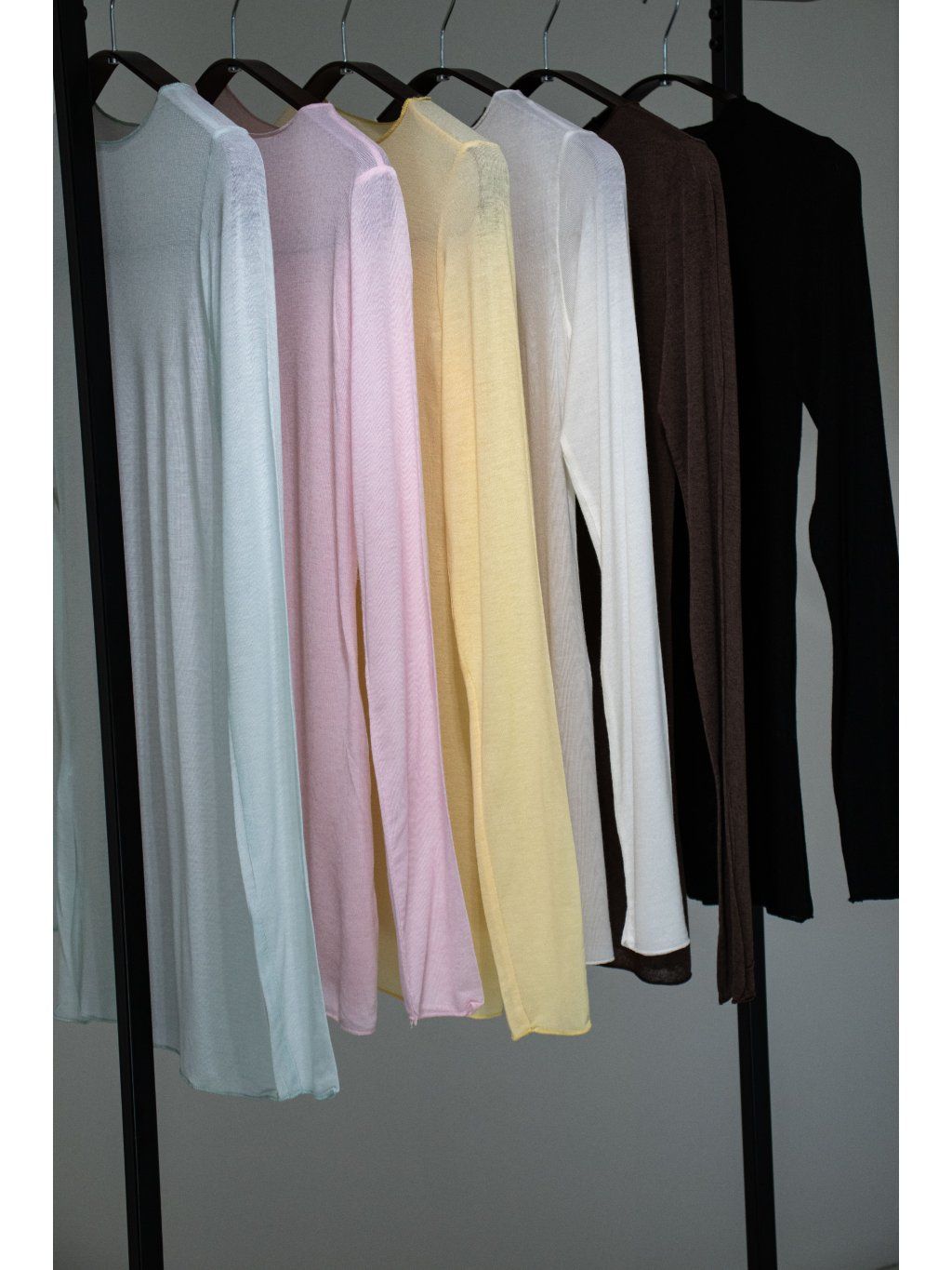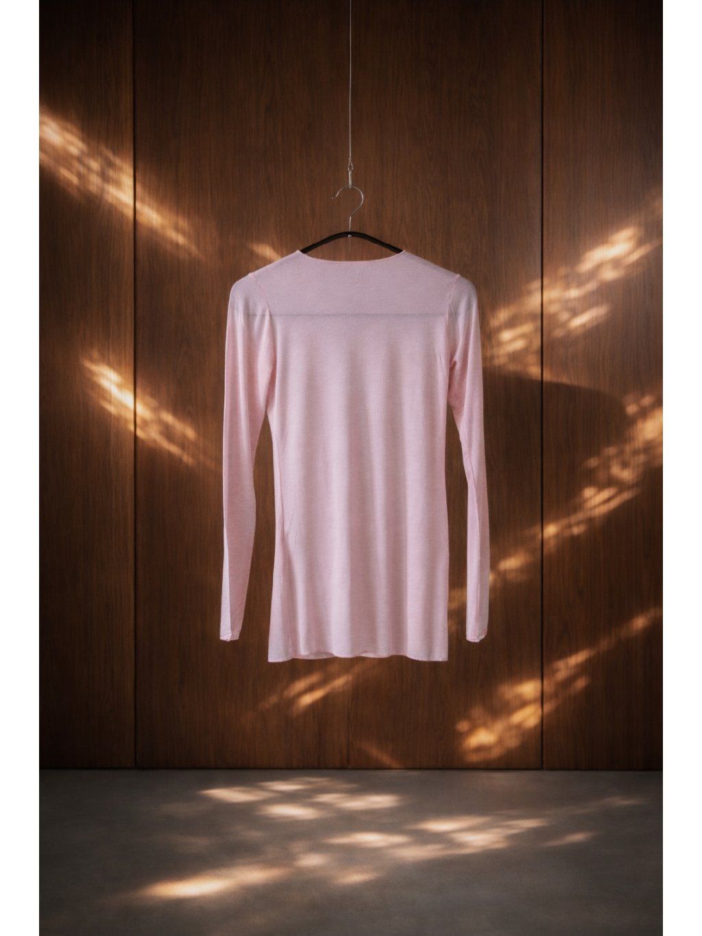 Lehké triko s dlouhým rukávem, pružný, příjemný, měkký, lehce prosvítá. Přírodní materiál s elastanem a podílem kašmíru.