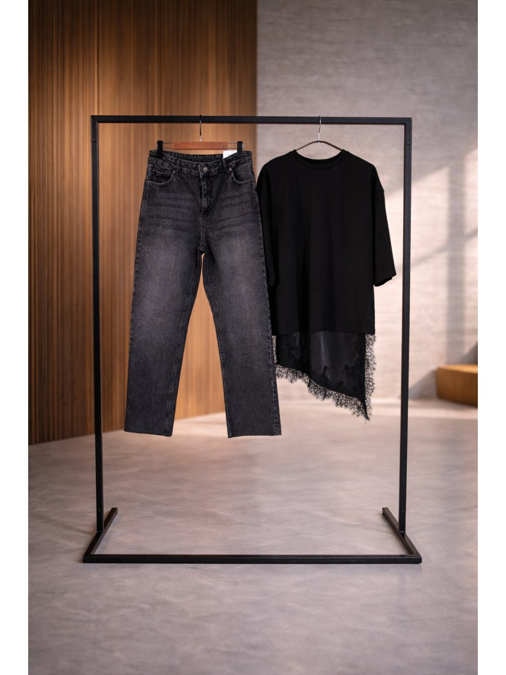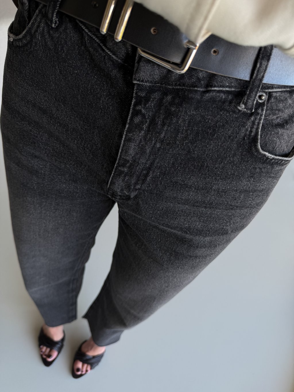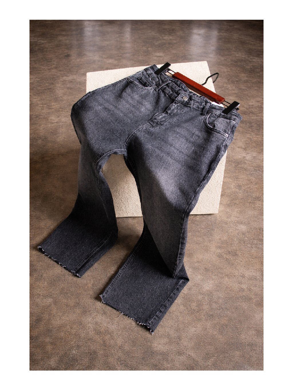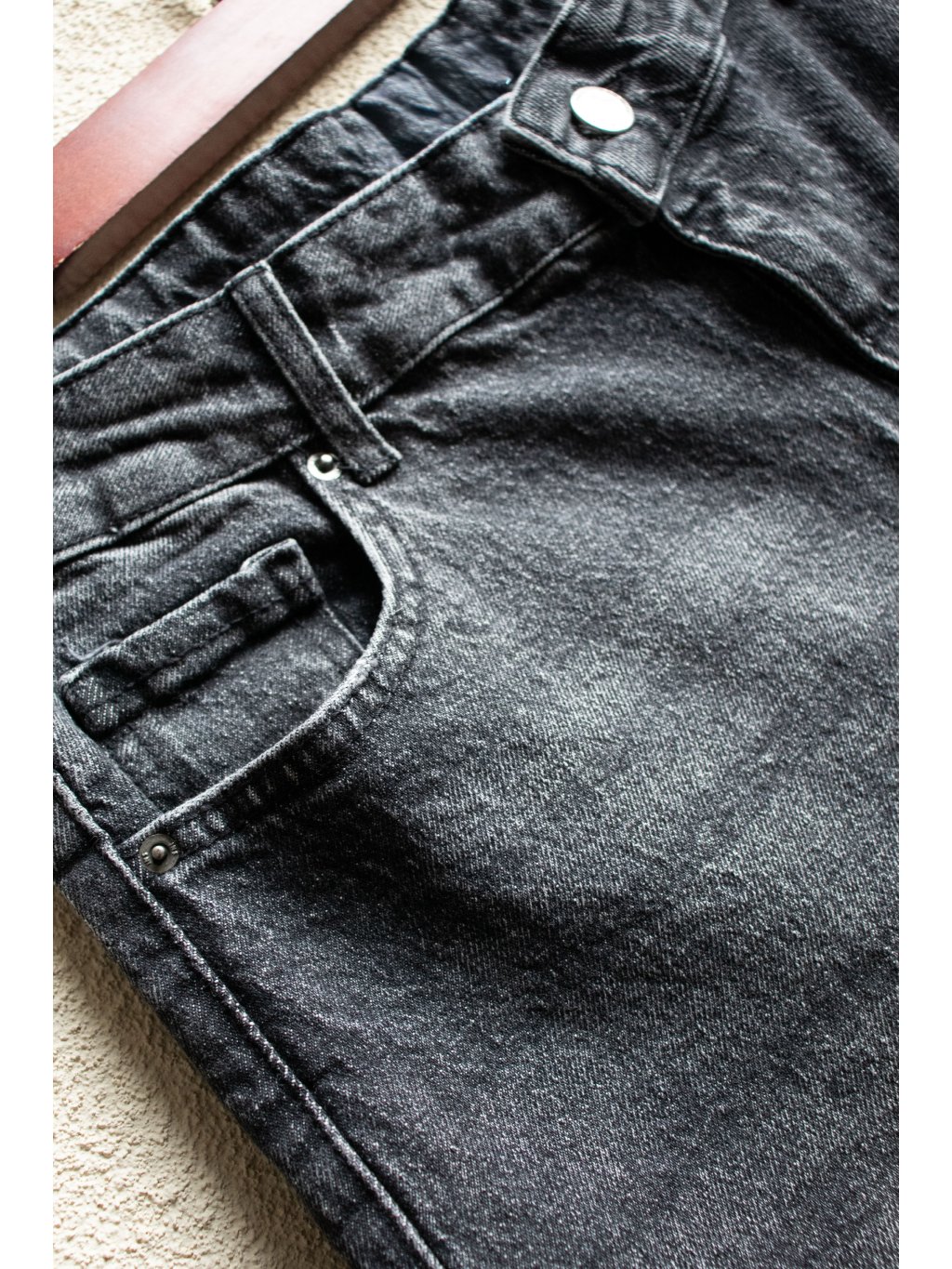 Džíny rovného střihu, vyšší pas, zapínání na zip a denim knoflík, přední i zadní kapsy, barva je šisovaná, konce nohavic jsou ustřihnuté nejsou tedy zapošité.