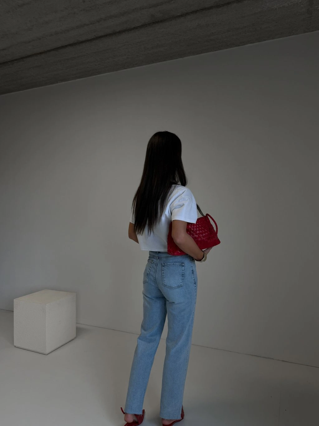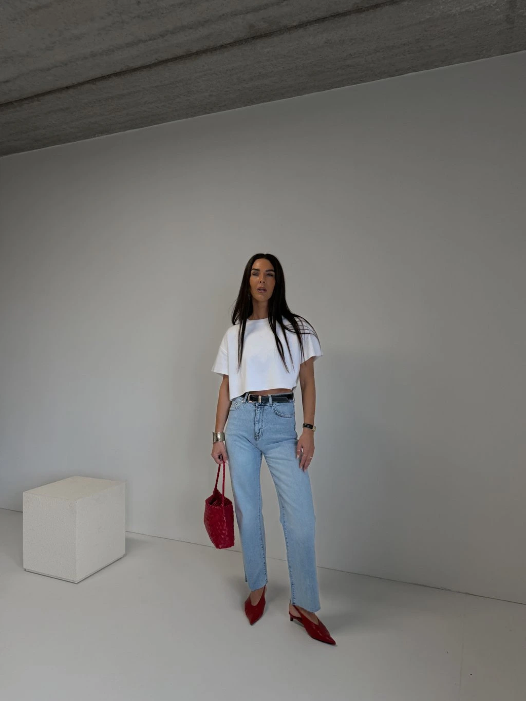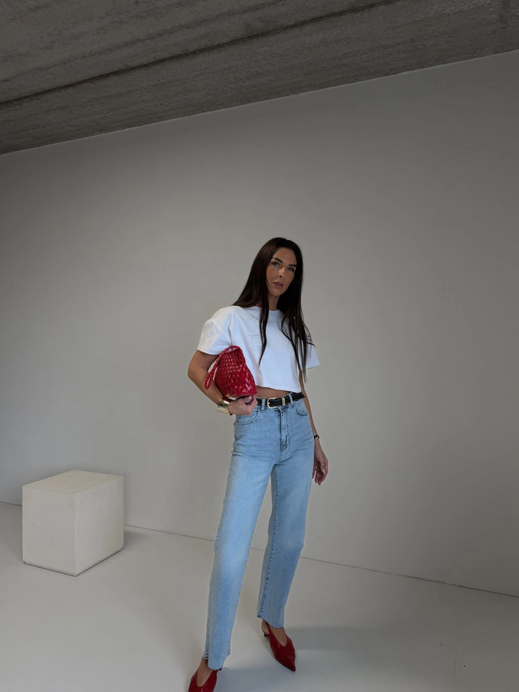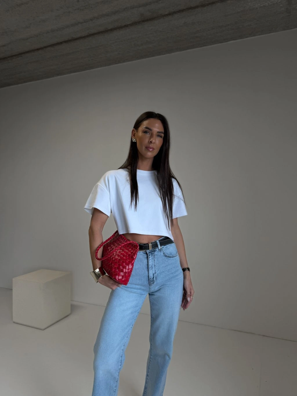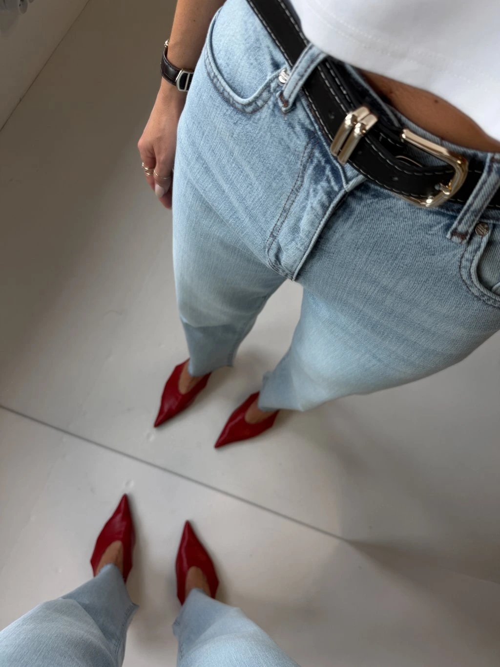 Džíny rovného střihu, vysoký pas, zapínání na zip a denim knoflík, součástí je černý pásek se zlatou hranatou sponou, délka nad kotníky, přední i zadní kapsy, barva je šisovaná, konce nohavic jsou ustřihnuté nejsou tedy zapošité.