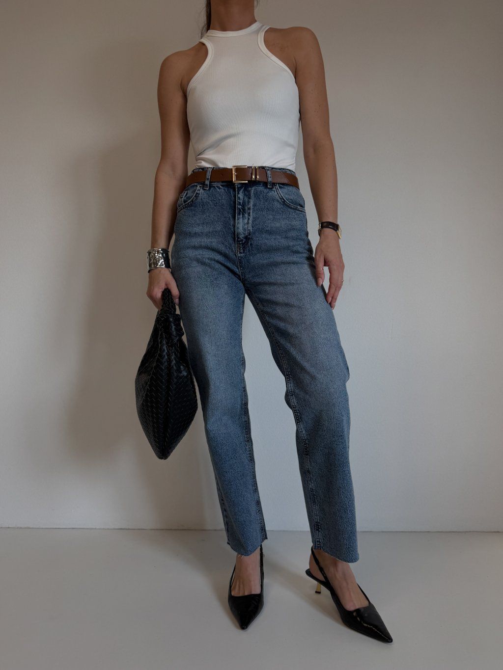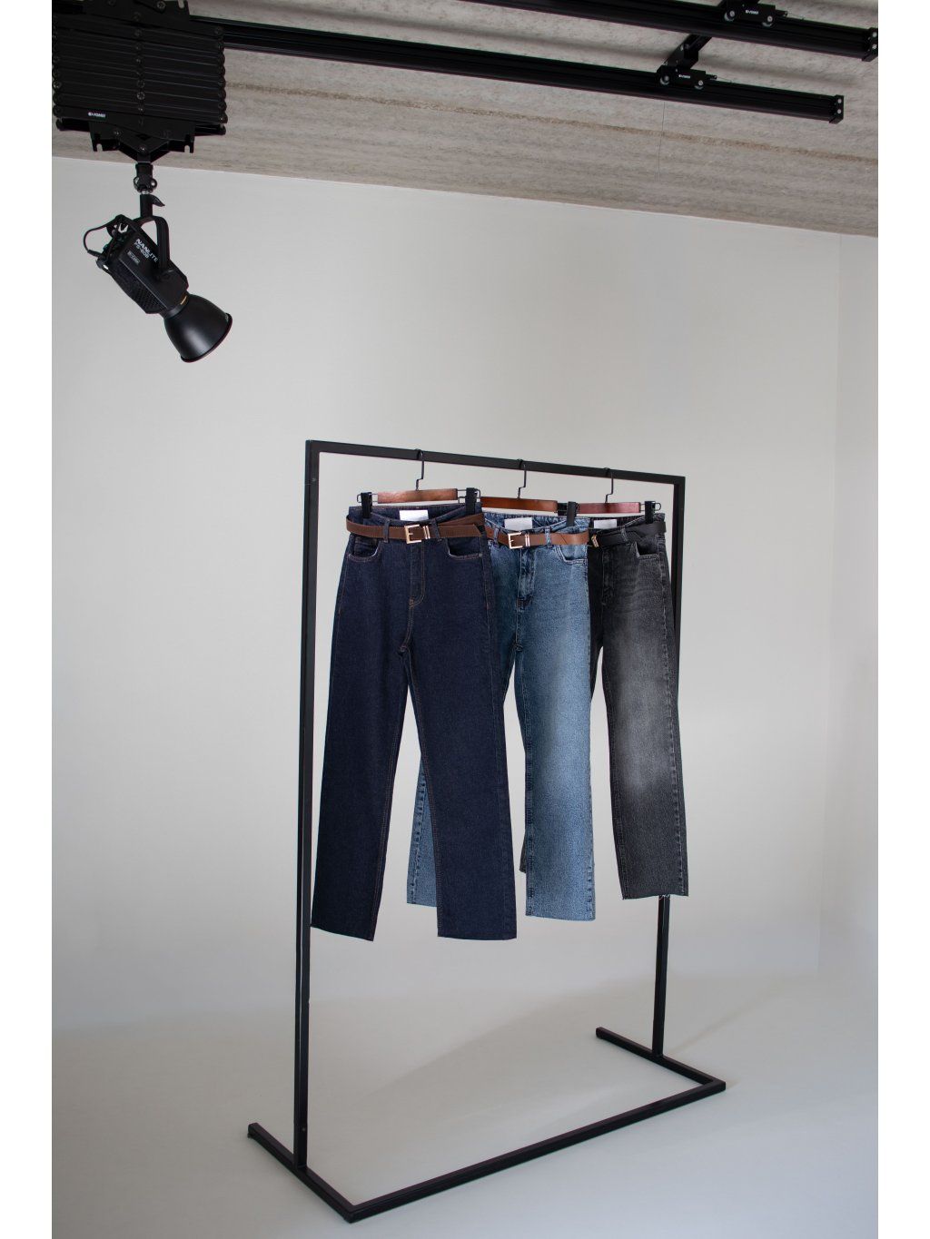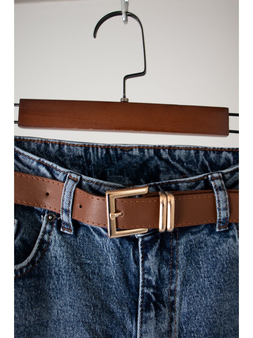 Džíny rovného střihu, vysoký pas, zapínání na zip a denim knoflík, součástí je hnědý pásek se zlatou hranatou sponou, délka nad kotníky, přední i zadní kapsy, barva je šisovaná, konce nohavic jsou ustřihnuté nejsou tedy zapošité.