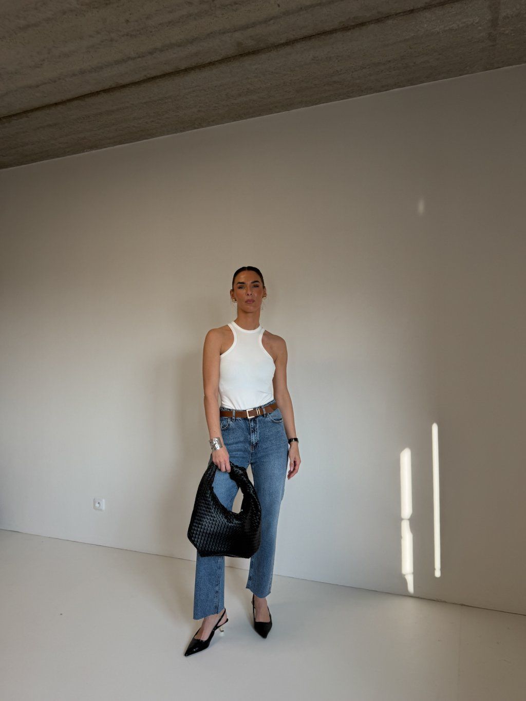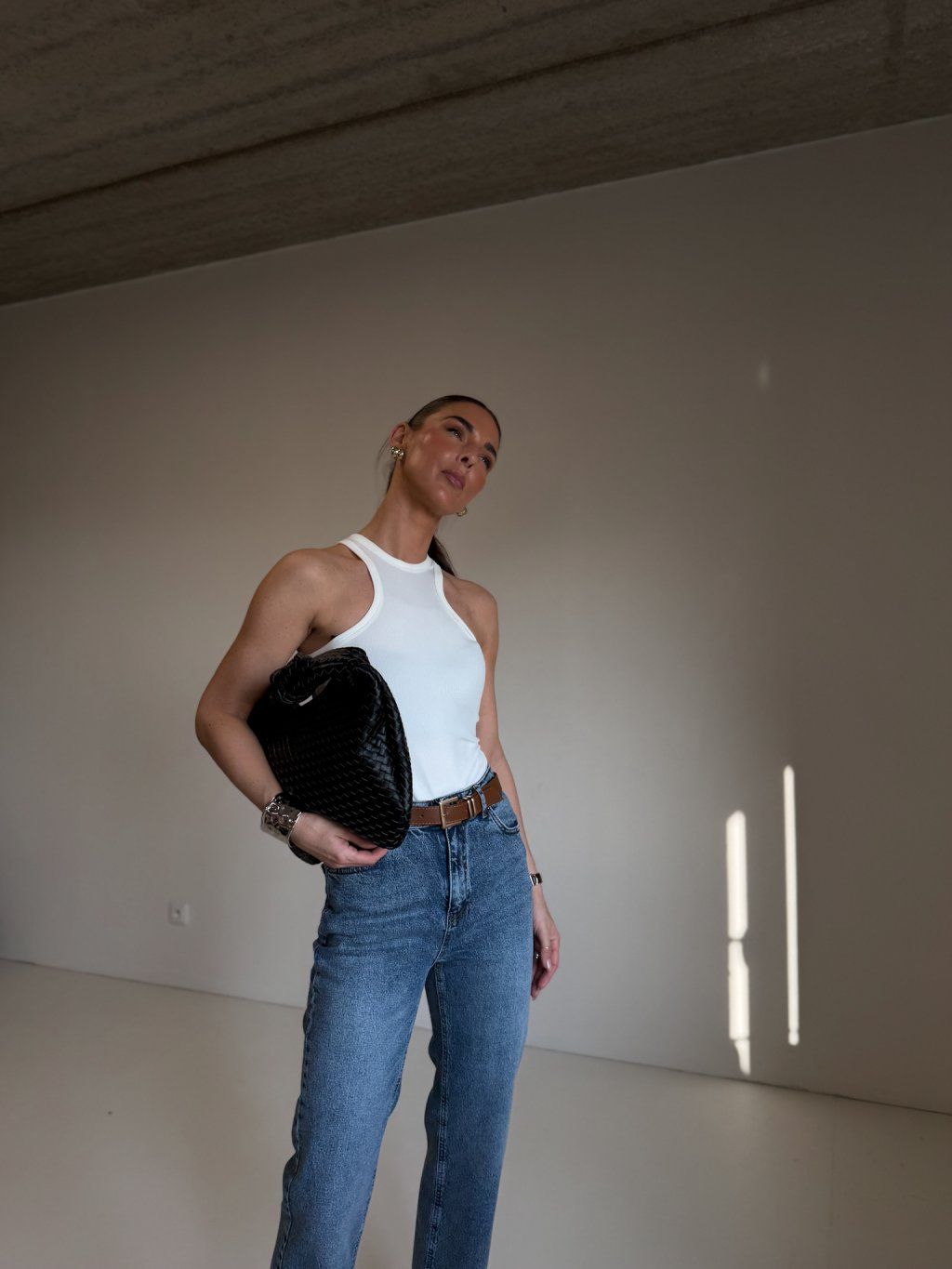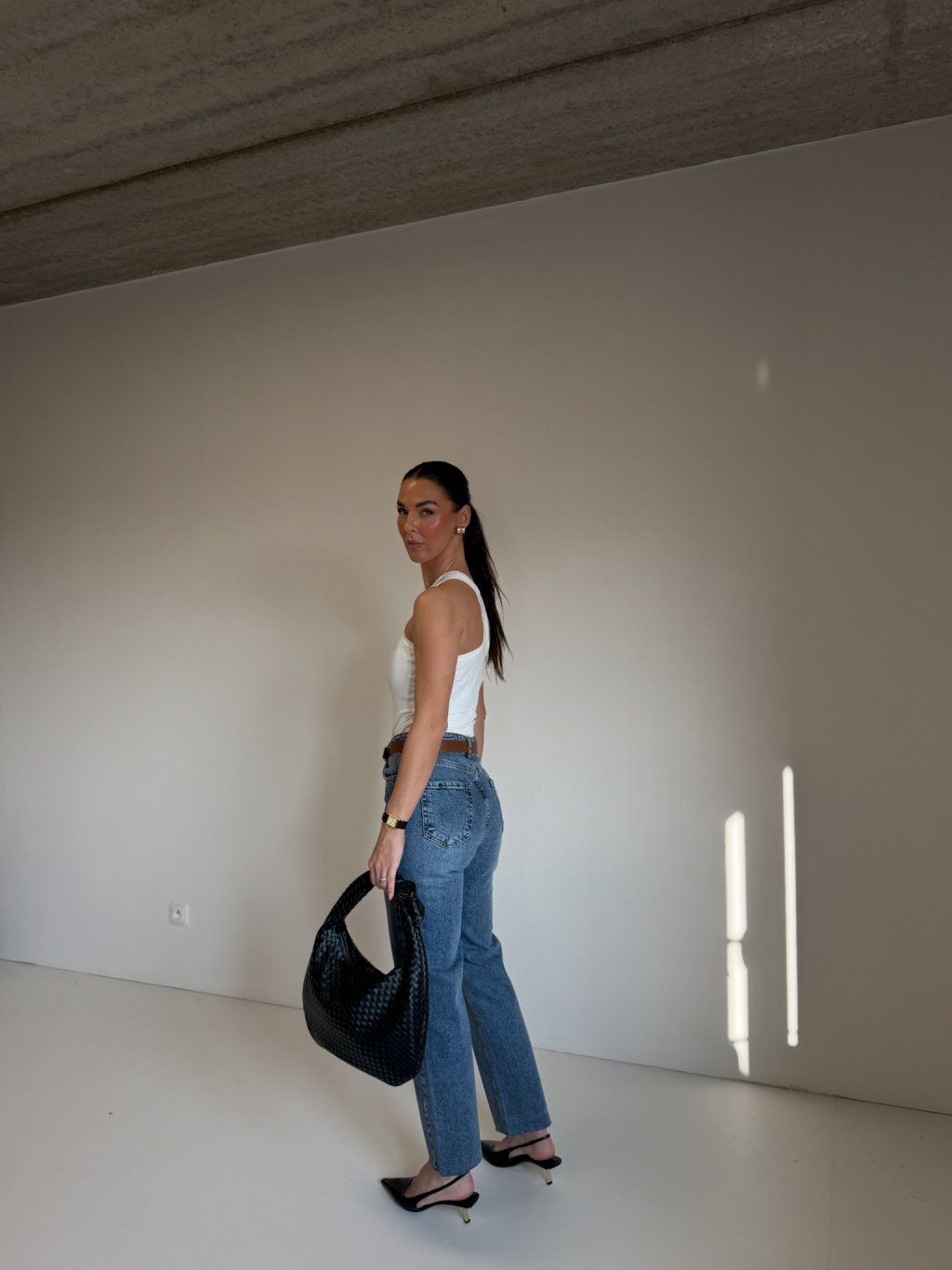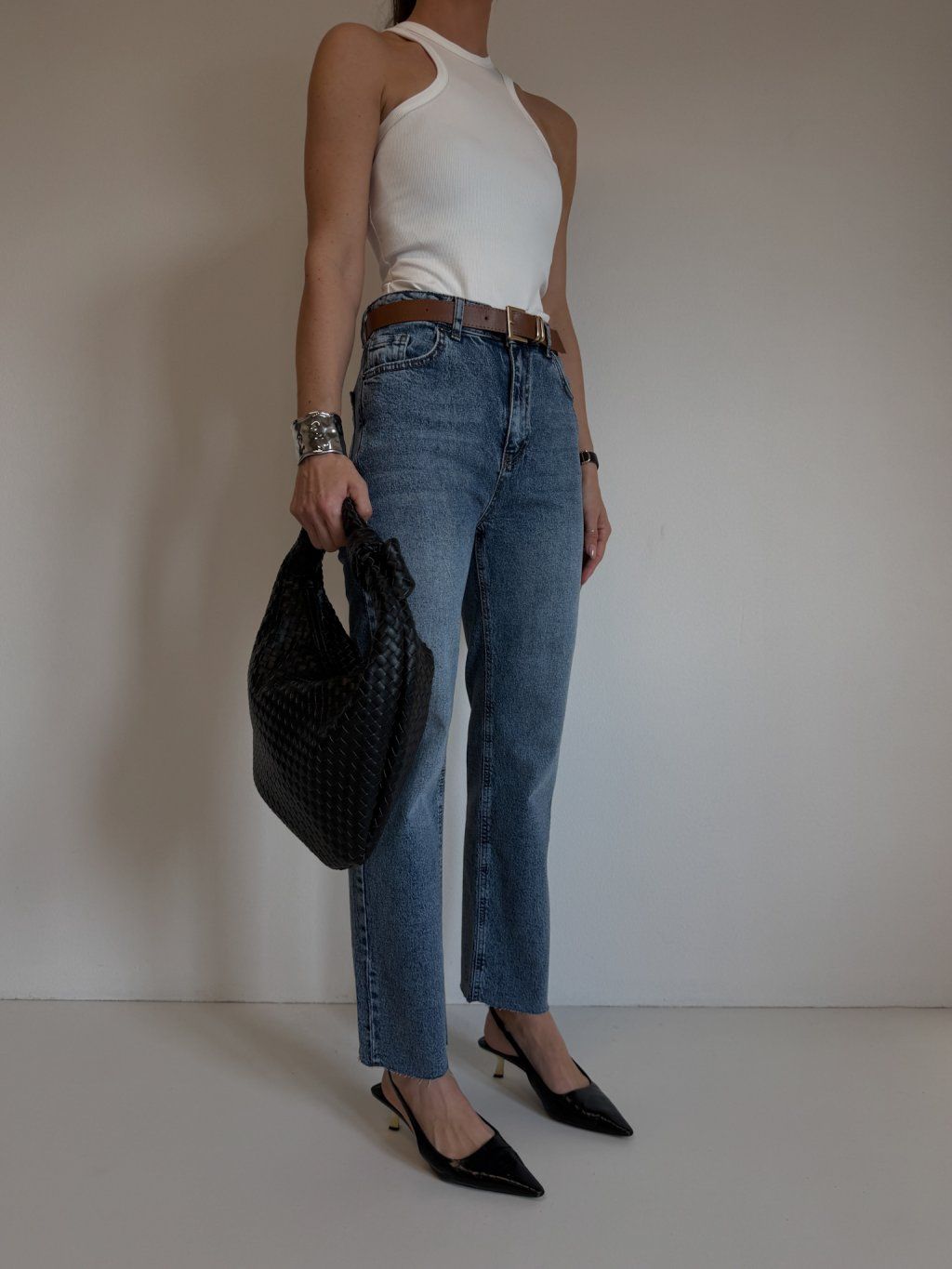 Džíny rovného střihu, vysoký pas, zapínání na zip a denim knoflík, součástí je hnědý pásek se zlatou hranatou sponou, délka nad kotníky, přední i zadní kapsy, barva je šisovaná, konce nohavic jsou ustřihnuté nejsou tedy zapošité.