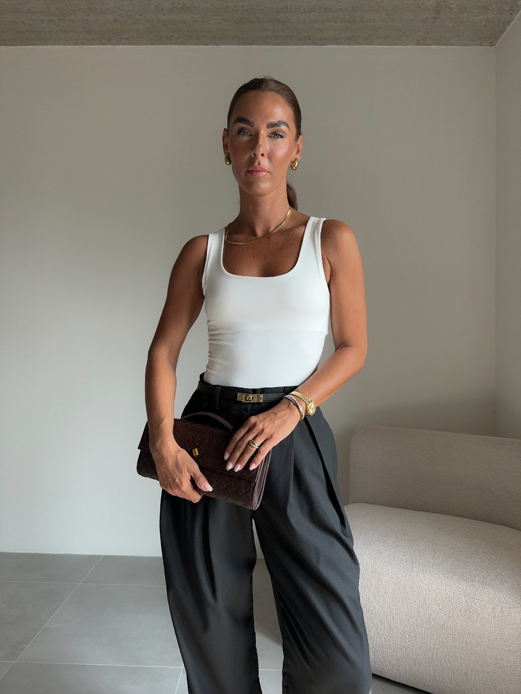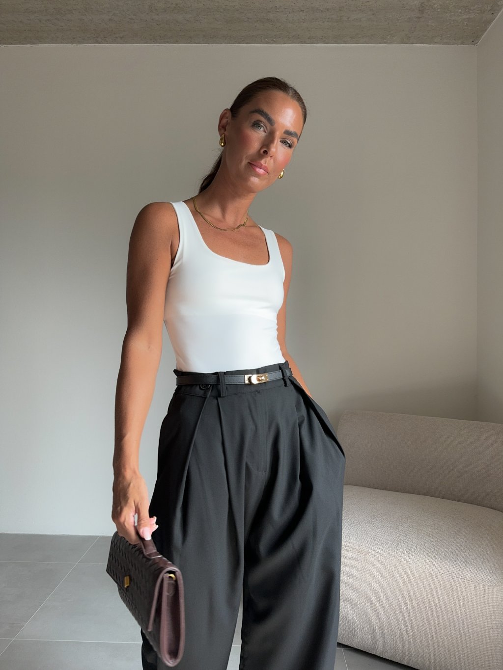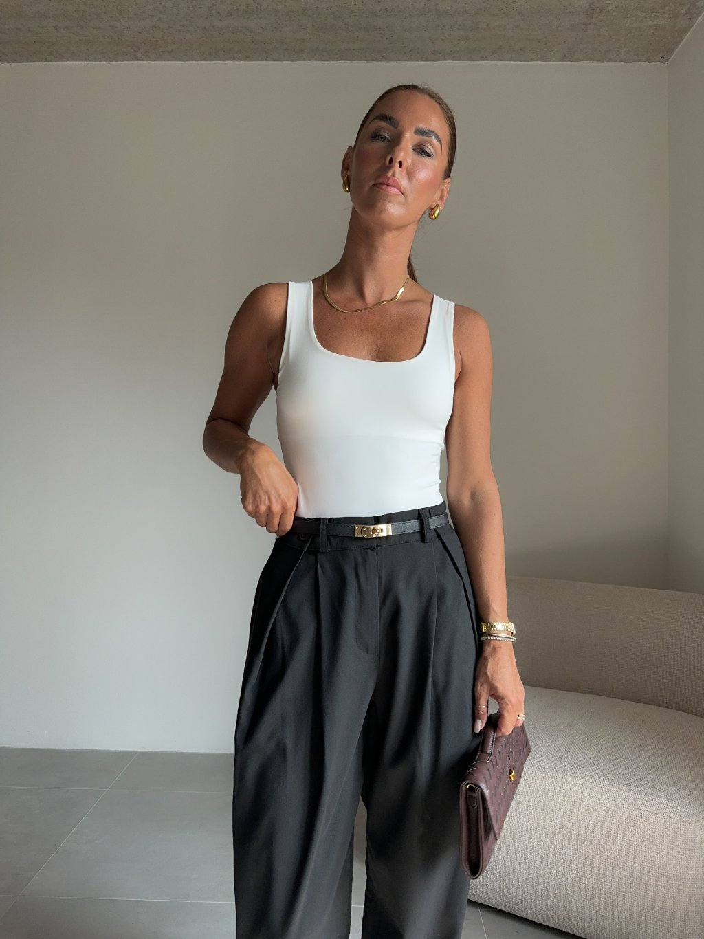 Modelka měří 173 cm, váha 56 kg. Běžně nosí velikost S/M a oversized oblečení L. |