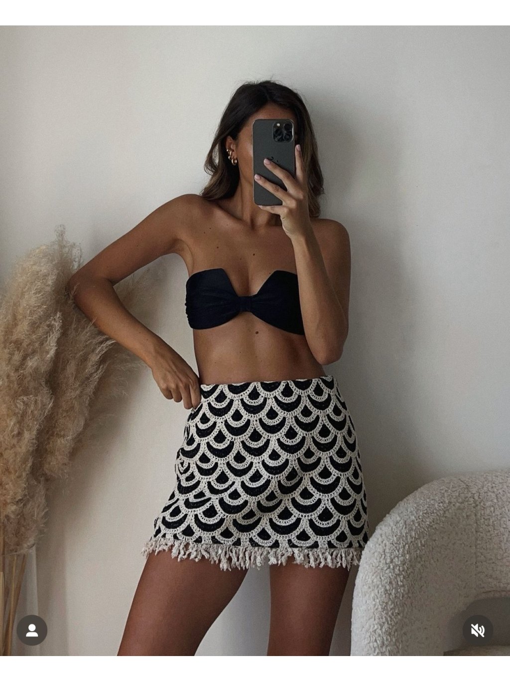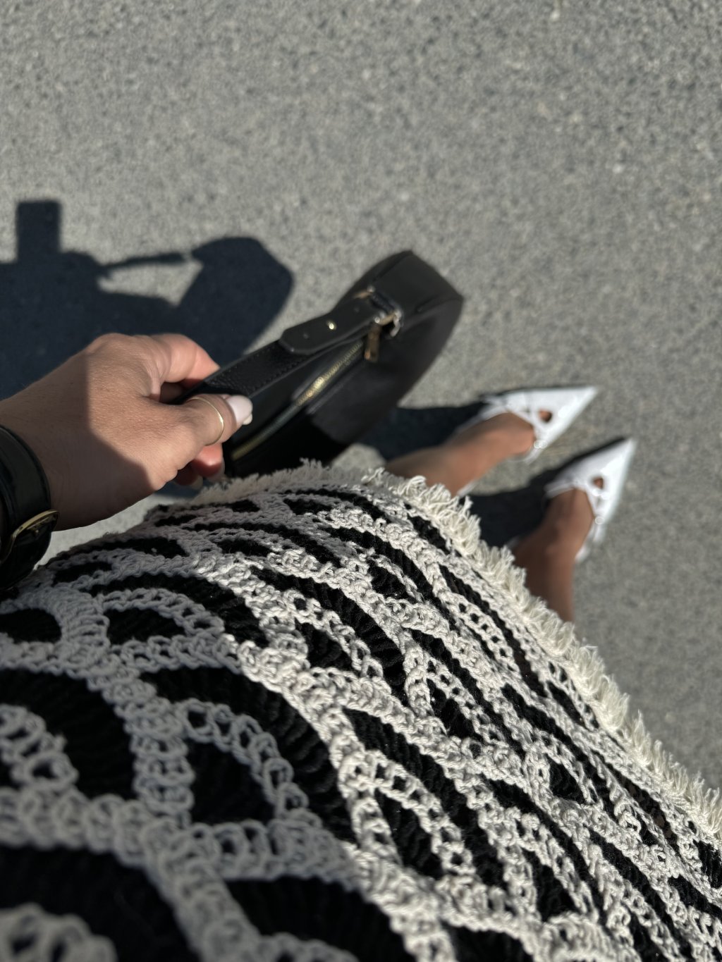 Sukně - černý podklad, háčkovaný vzor, spodní lem s jemnými třásněmi. Materiál pruží, vysoký pas, v pase je gume