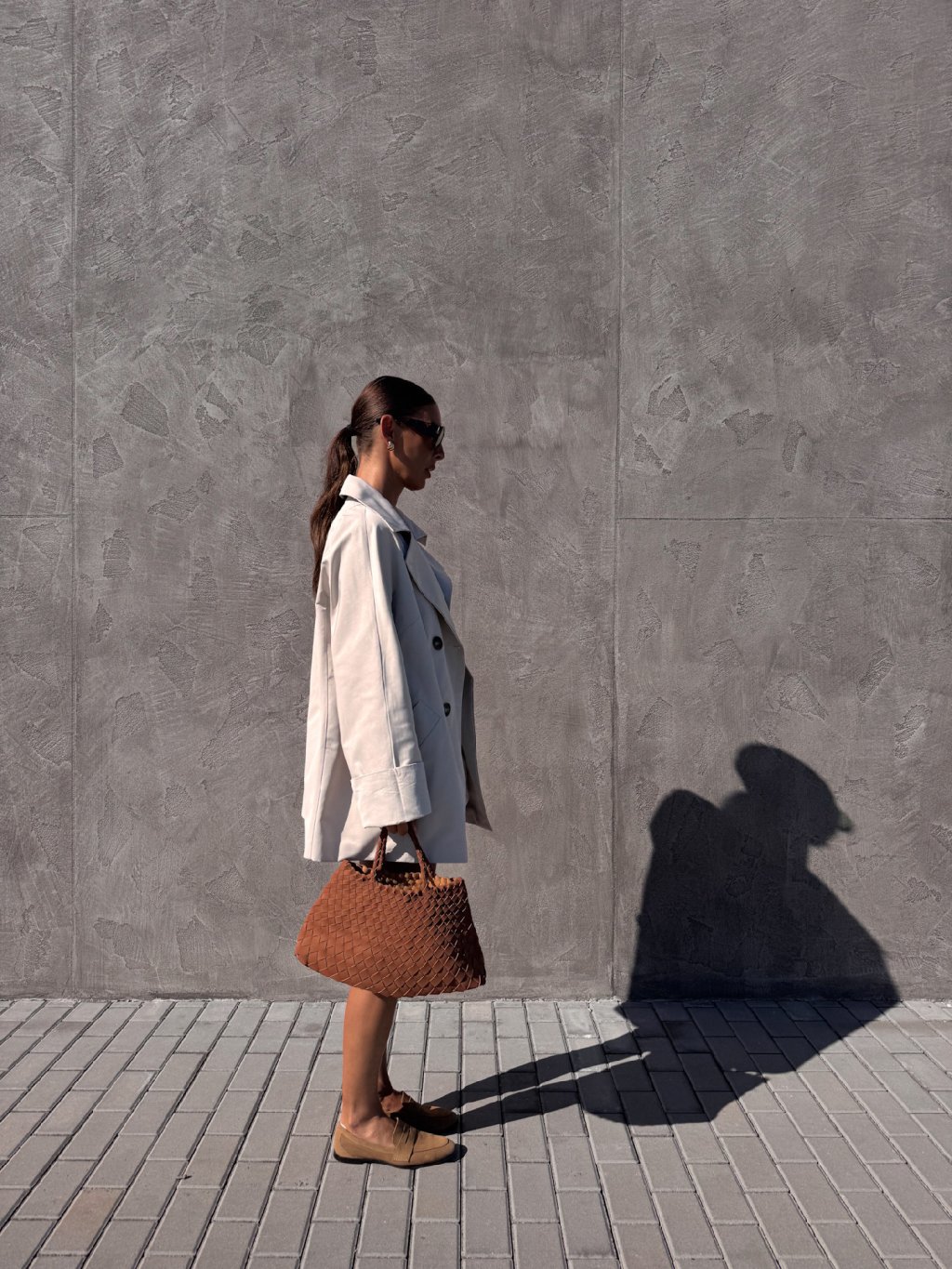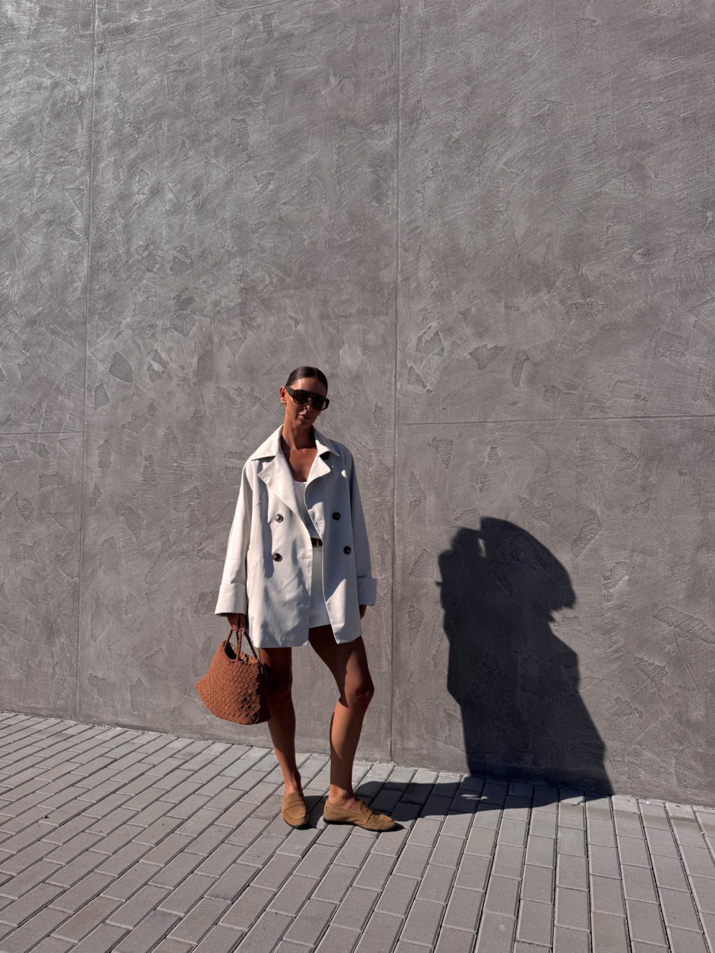 Oversized trench coat, jednoduchý, minimalistický střih, volný, áčkový.