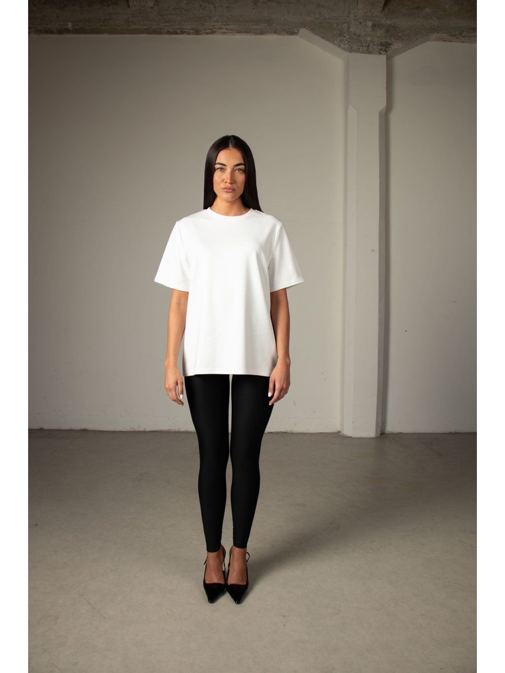 | Modelka měří 173 cm, váha 56 kg. Běžně nosí velikost S/M a oversized oblečení L. |