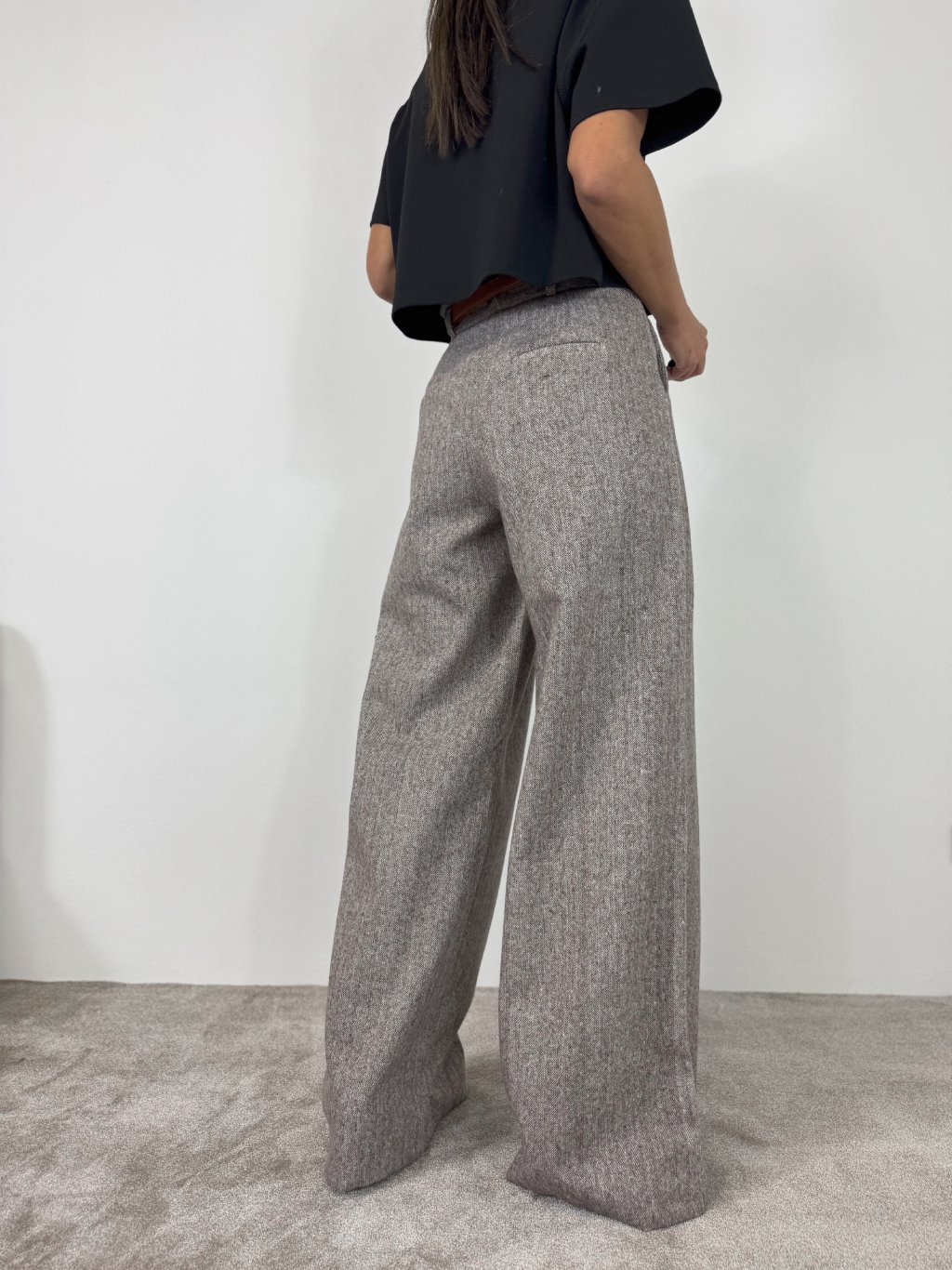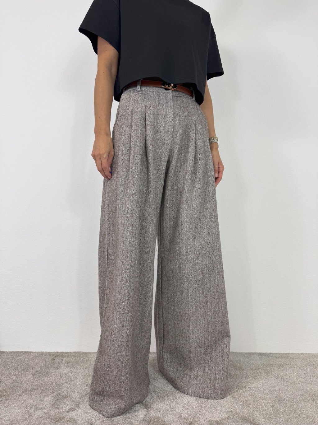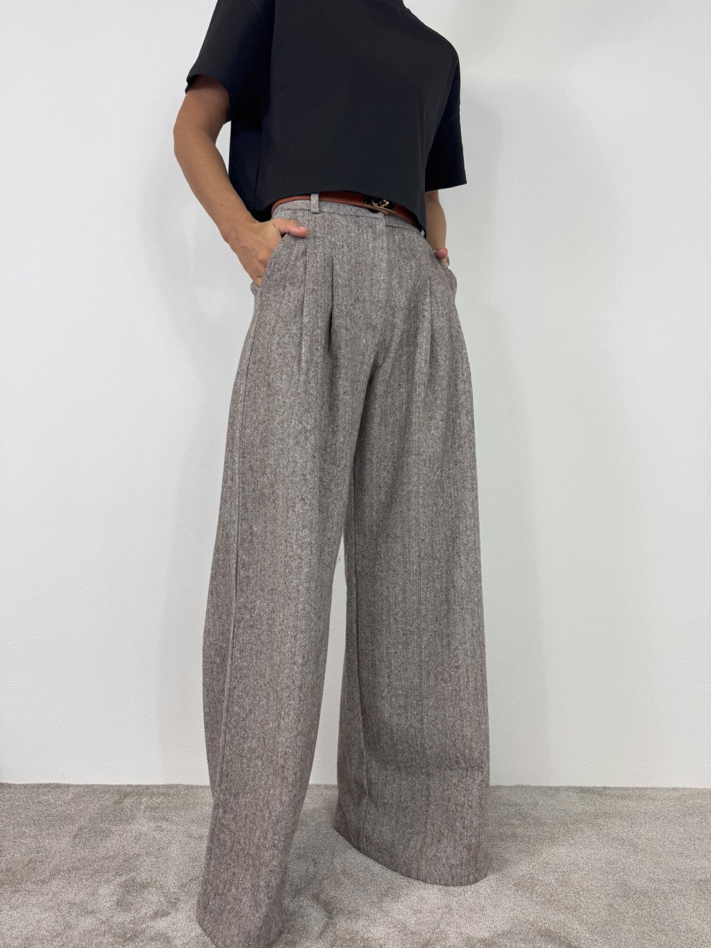 Tvídové kalhoty, široký střih, v přední části nabírání. Materiál je s vysokou gramáží, pevný, hutný, teplý, drží tvar.