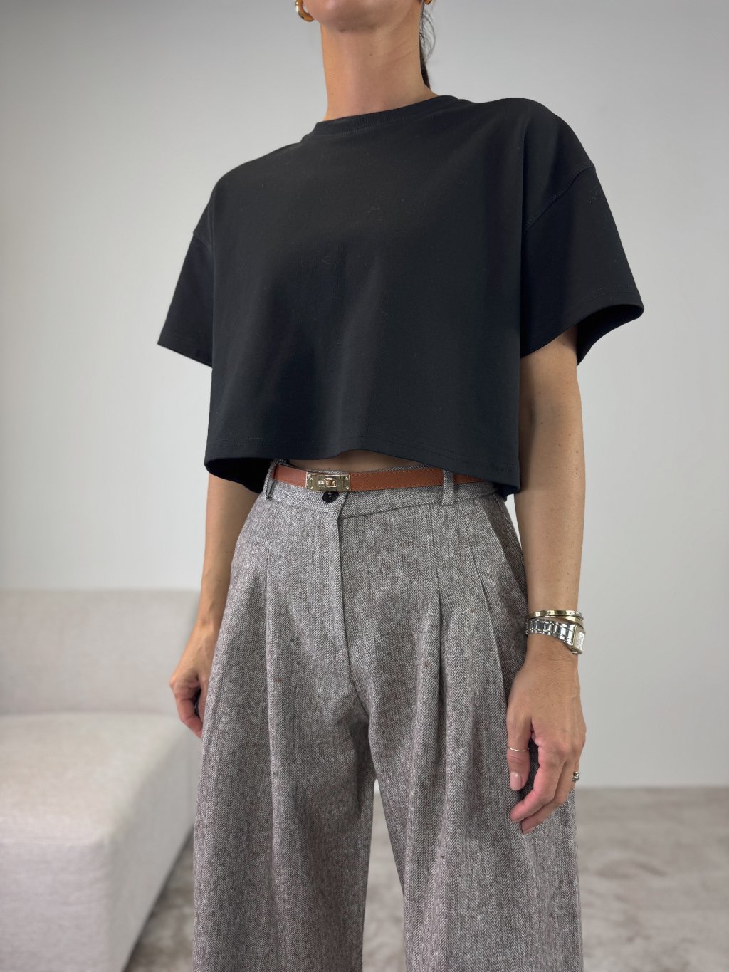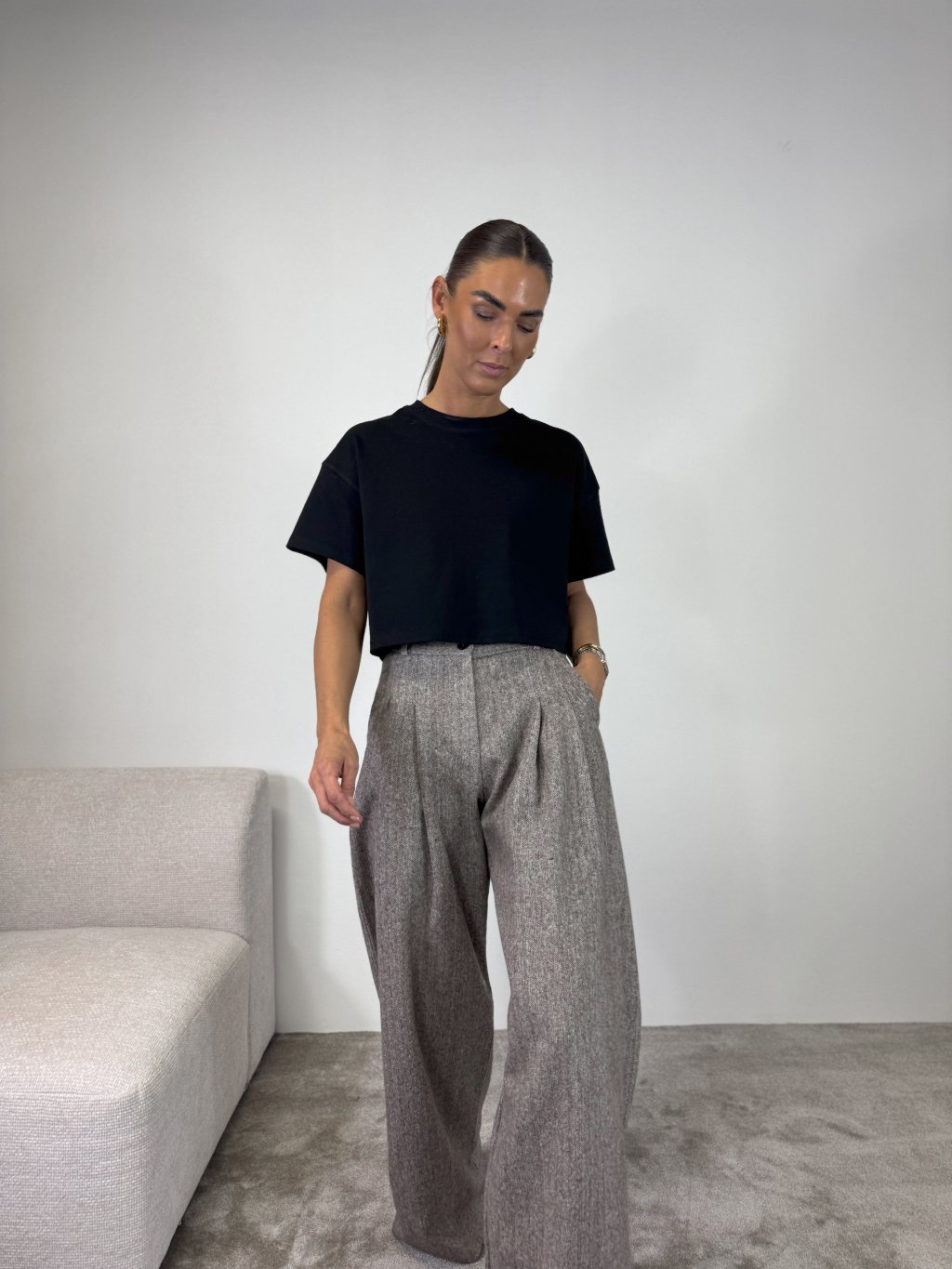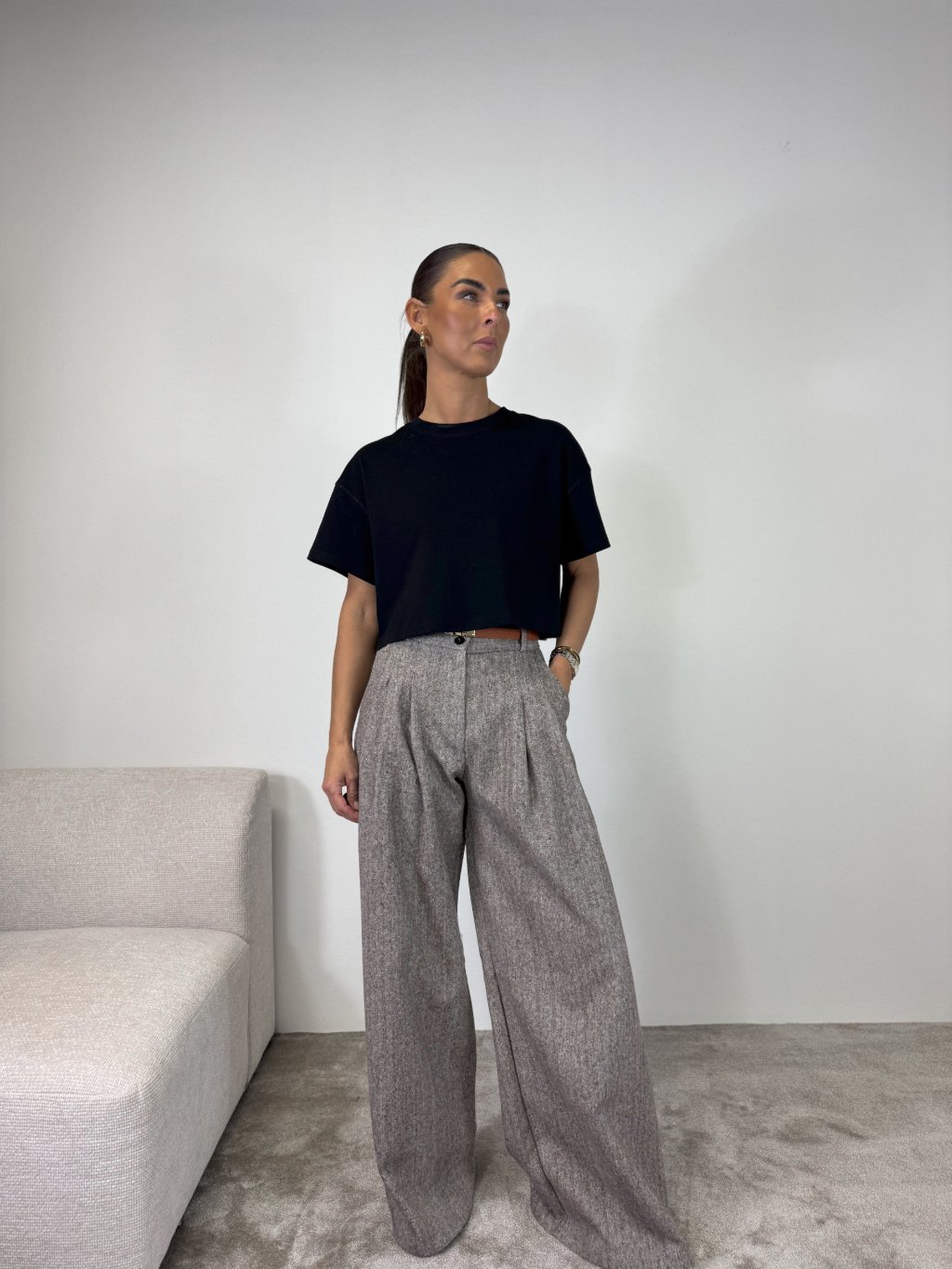 Tvídové kalhoty, široký střih, v přední části nabírání. Materiál je s vysokou gramáží, pevný, hutný, teplý, drží tvar.
