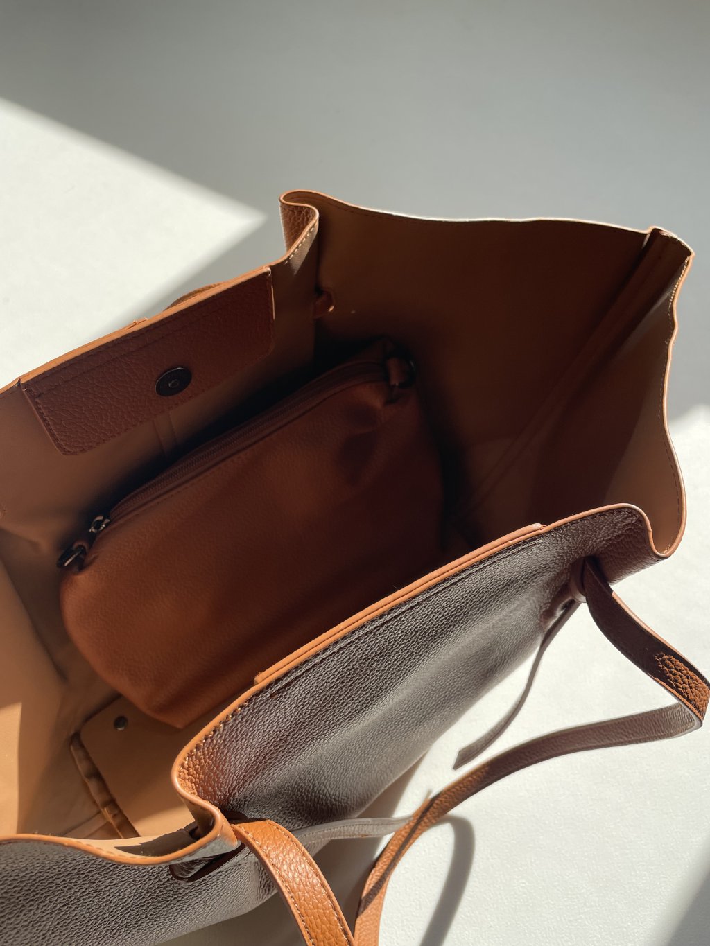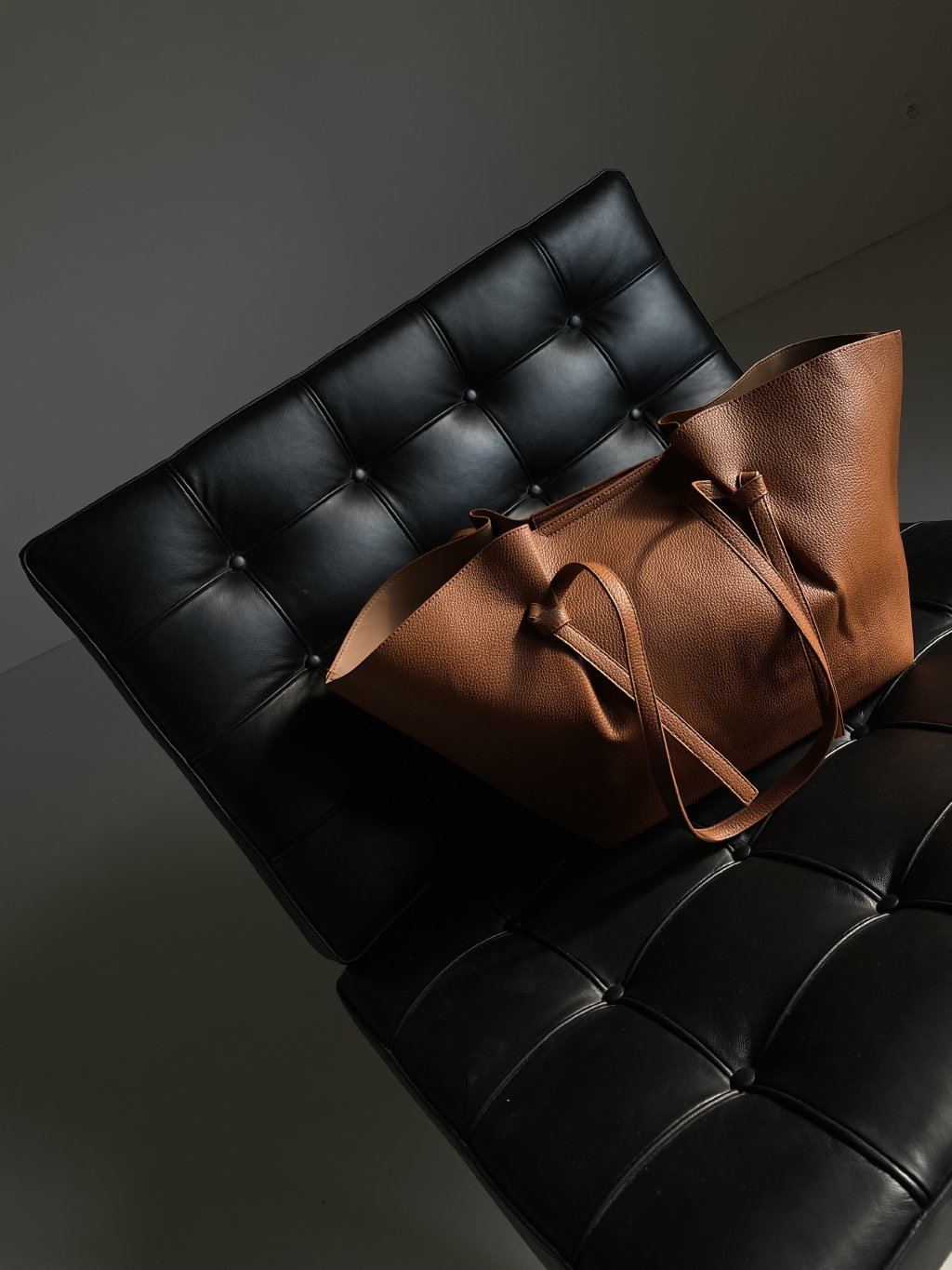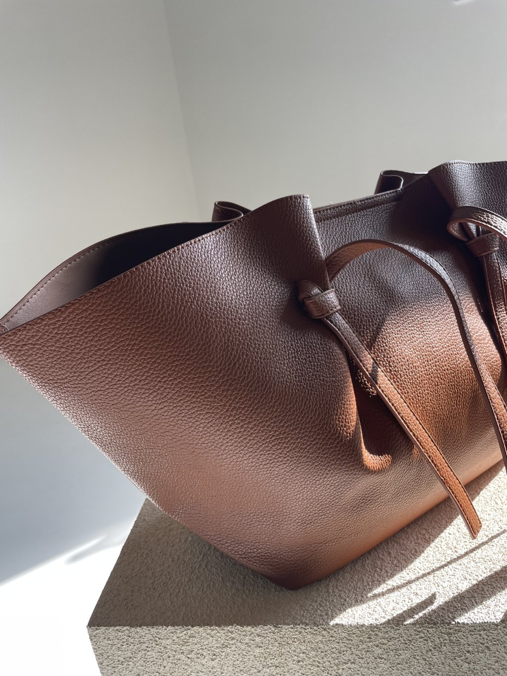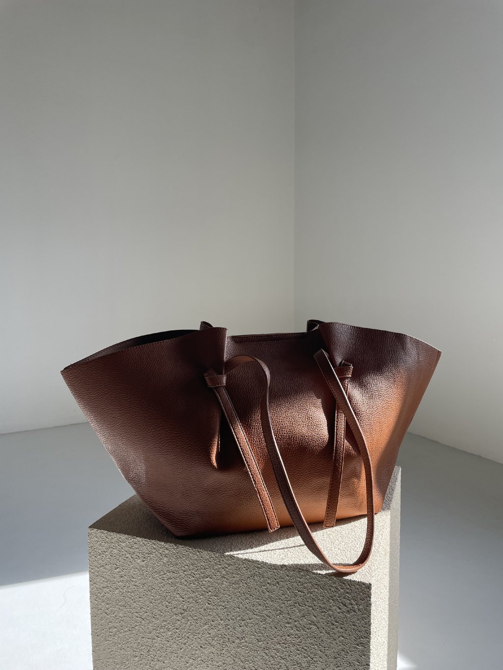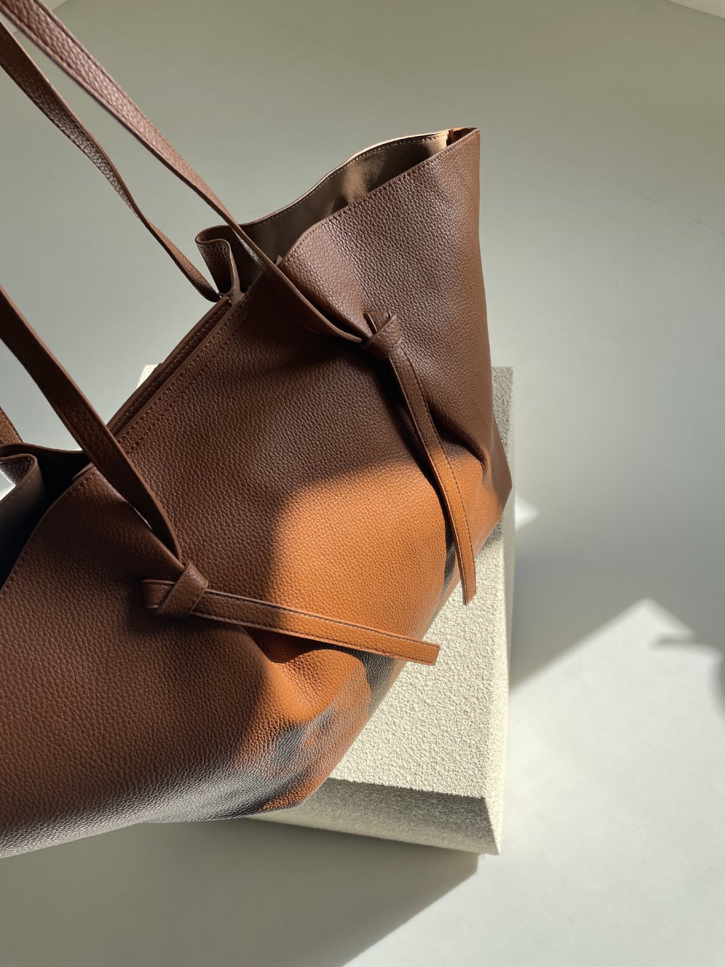 Velká shopper bag taška, zapínání na magnet, detaily zavázaného uzlu, uvnitř malá taštička na zip 28x21 cm a úzký popruh.
