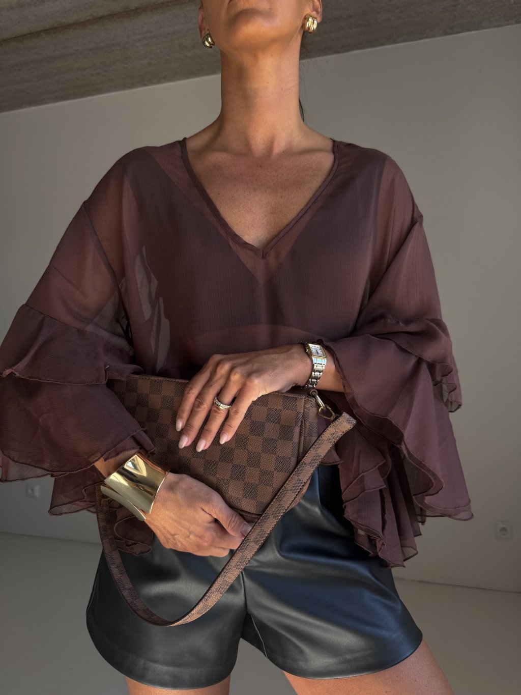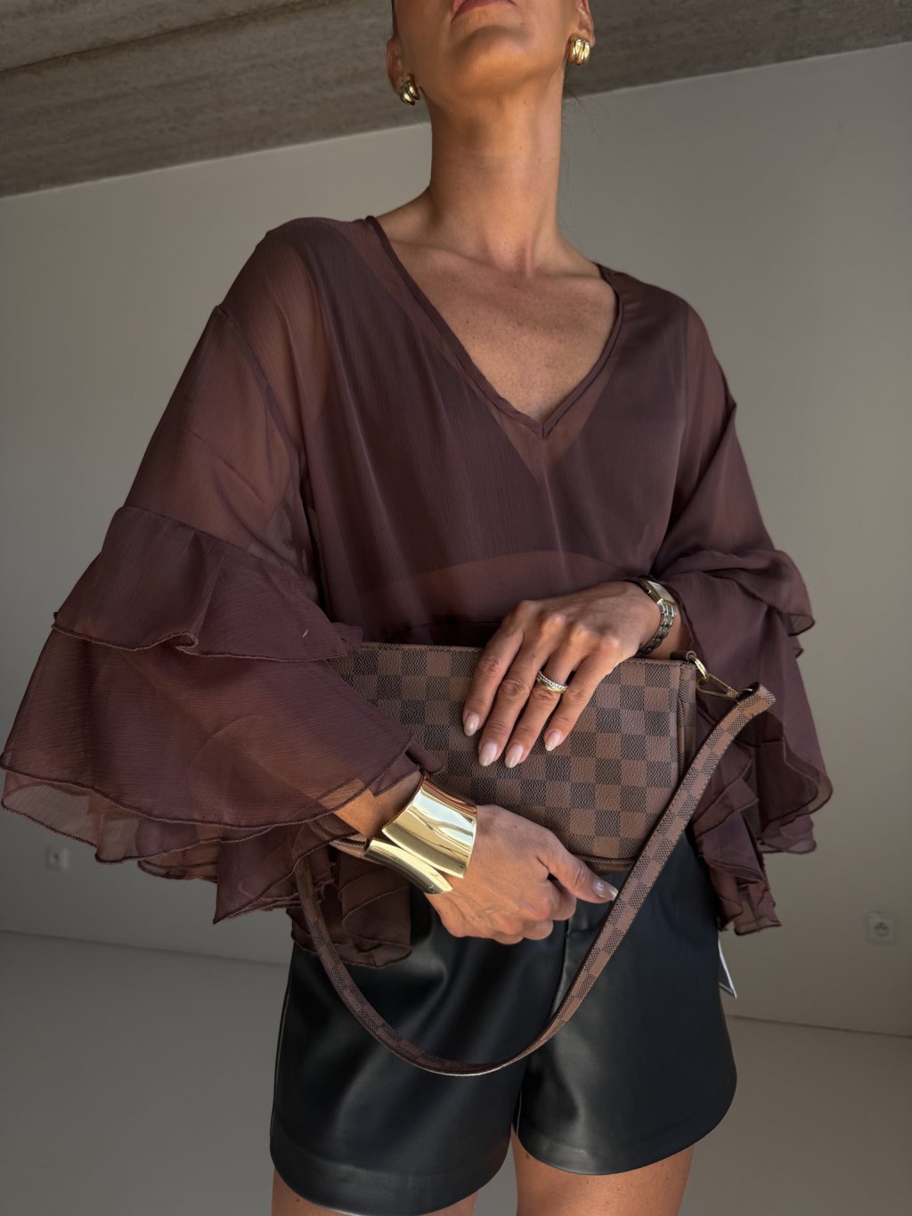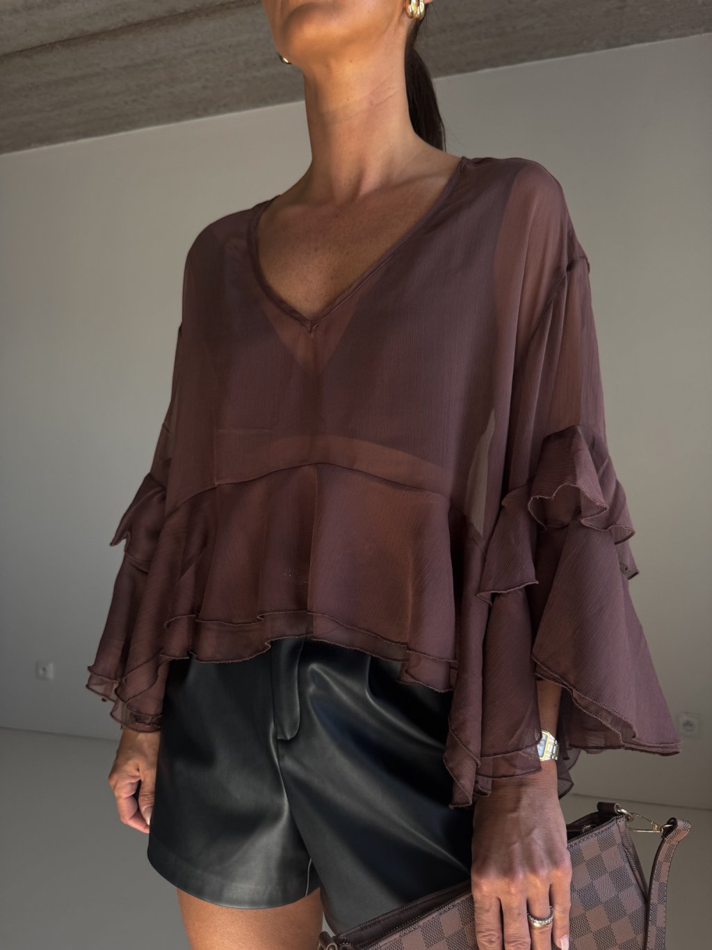 Lehoučký volánkový top s dlouhým rukávem a výstřihem do "V". Průsvitný materiál. Volánky jsou také na rukávech.