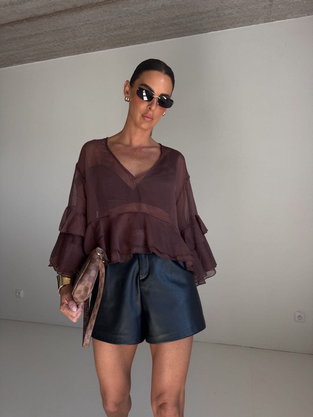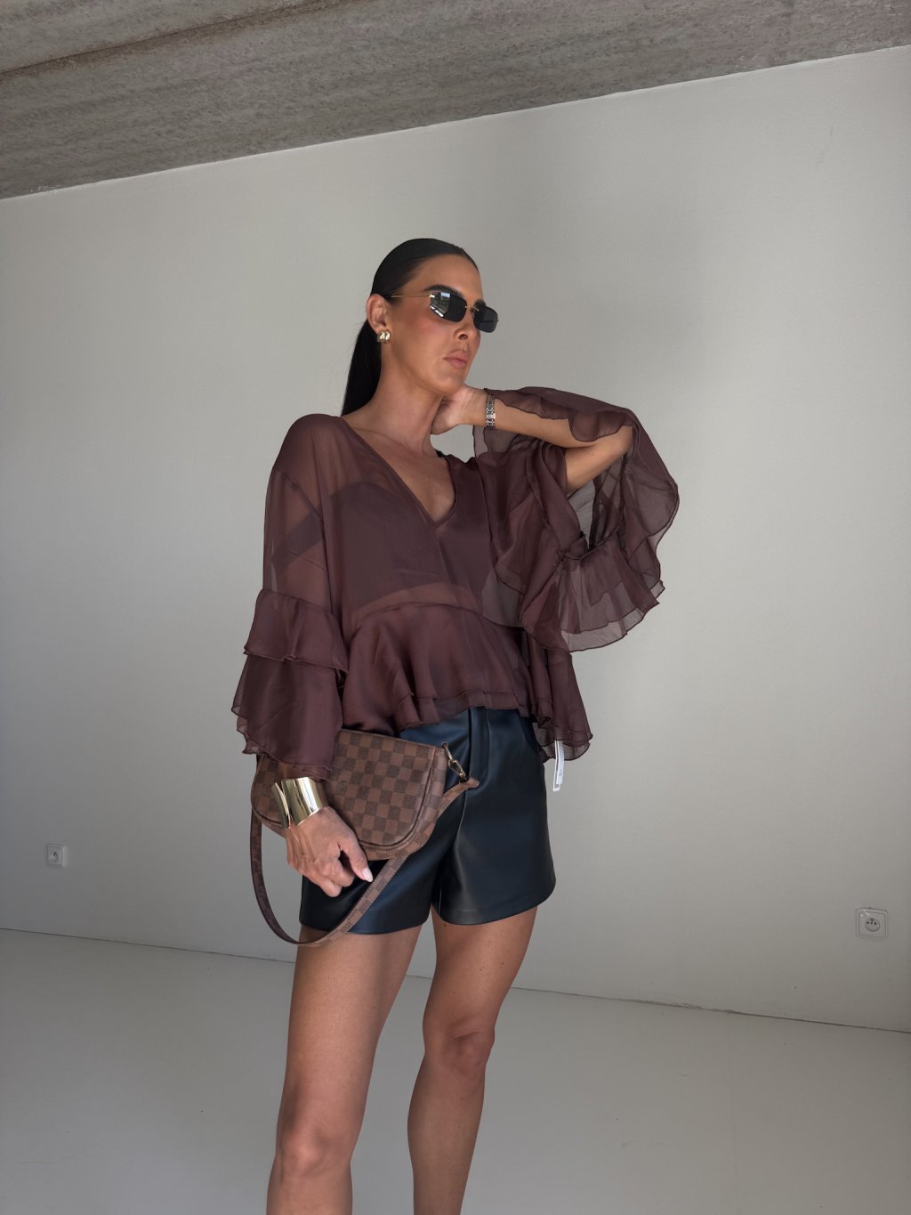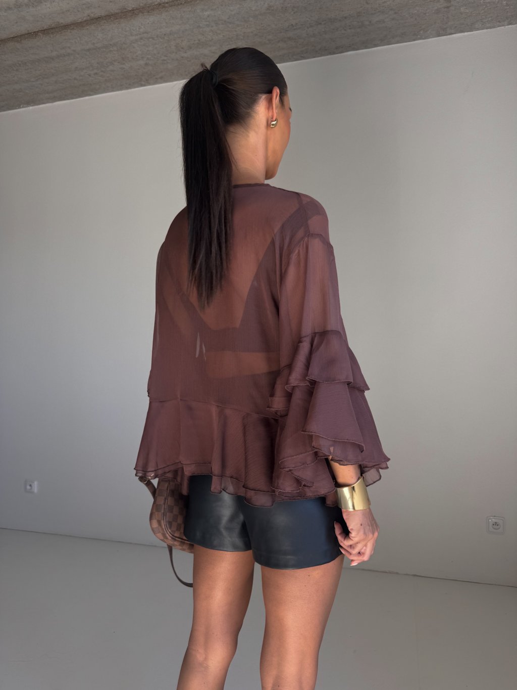 Lehoučký volánkový top s dlouhým rukávem a výstřihem do "V". Průsvitný materiál. Volánky jsou také na rukávech.
