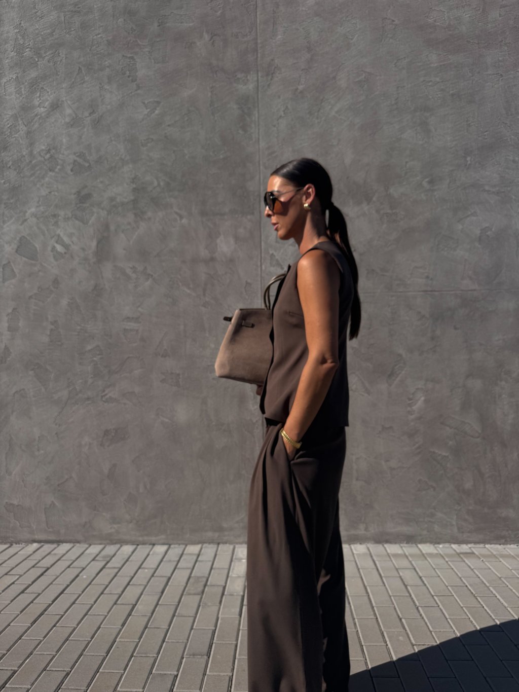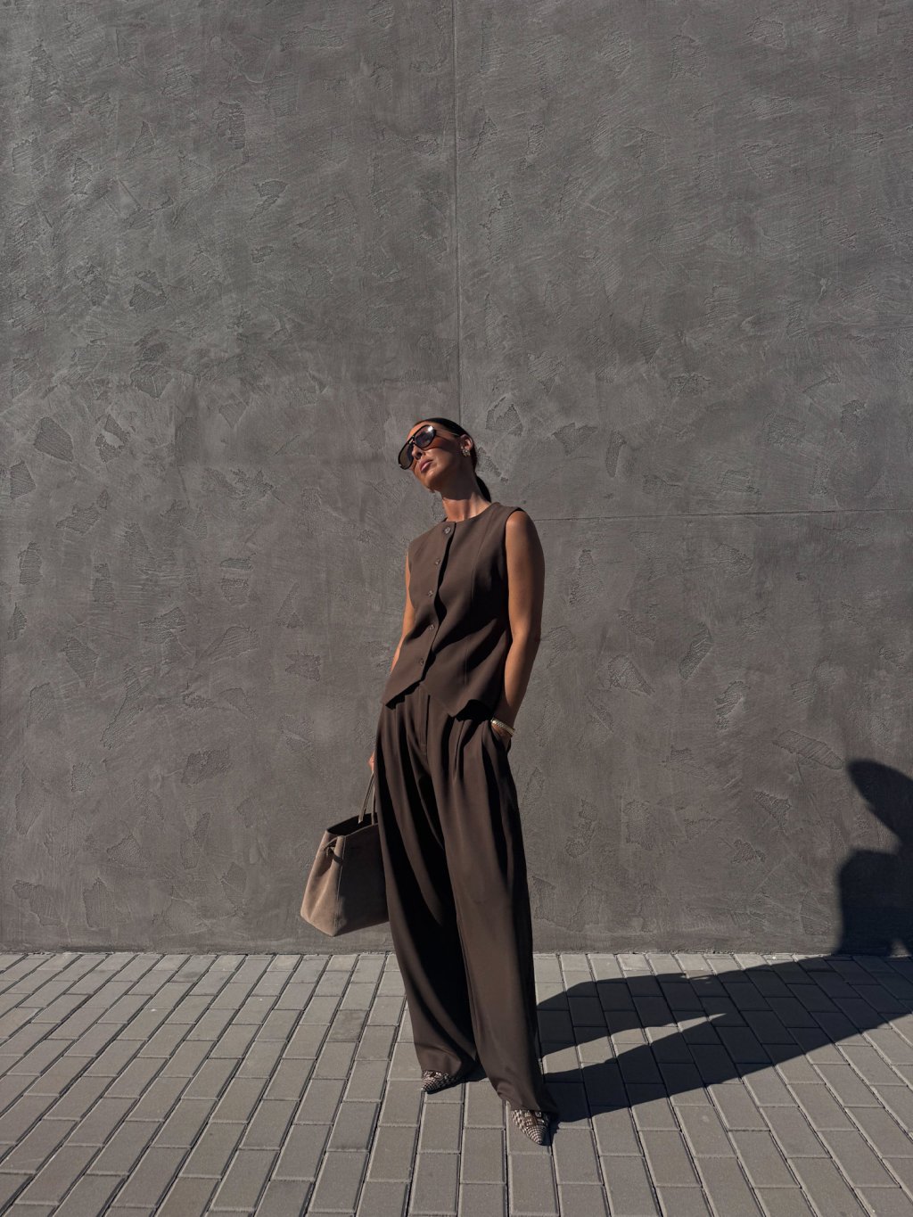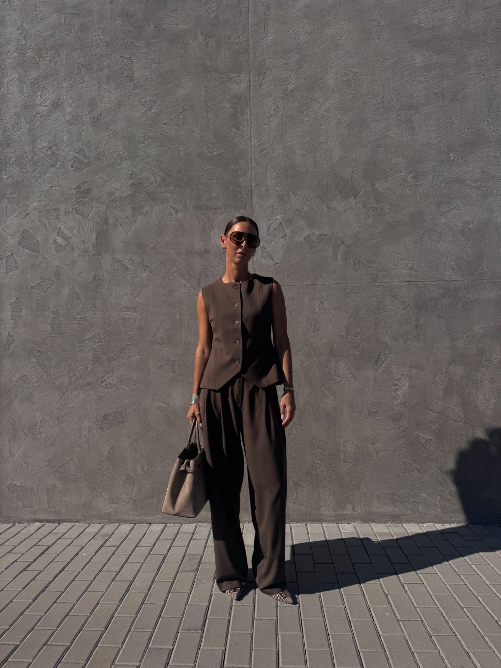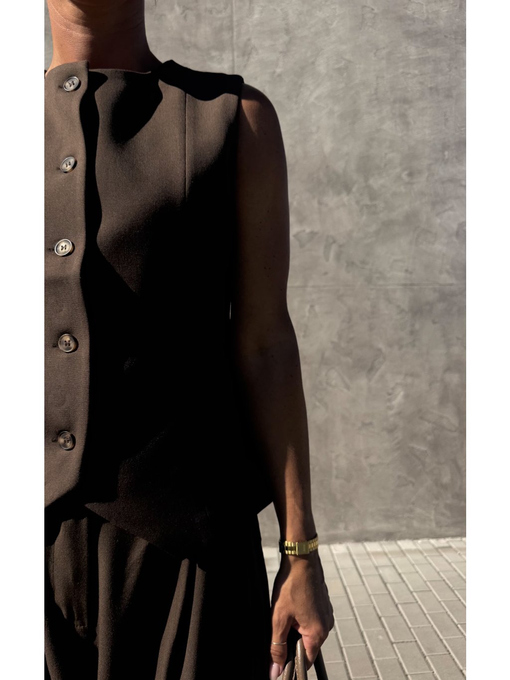Vypasovaná vesta, prodloužená délka, žíhané knoflíky, projmutý střih, podšívka.