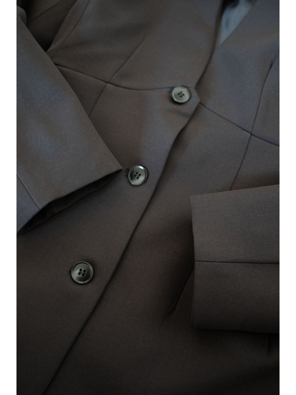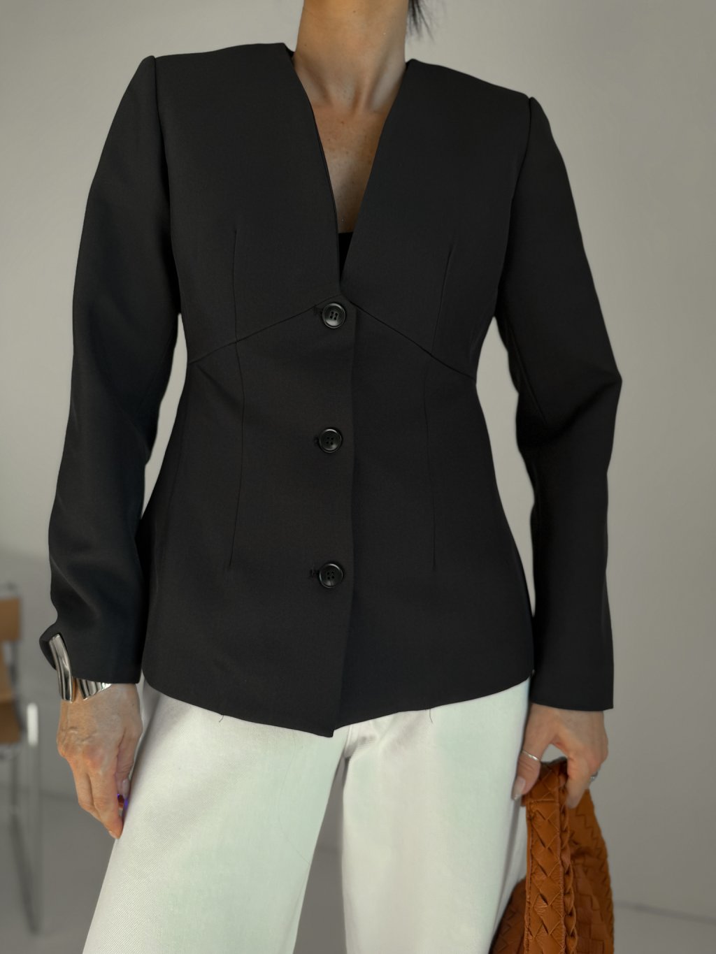 Vypasované sako, přiléhavý střih, materiál krásně drží tvar. Sako je bez límečku/bez klop, výstřih do "V", podšívka.