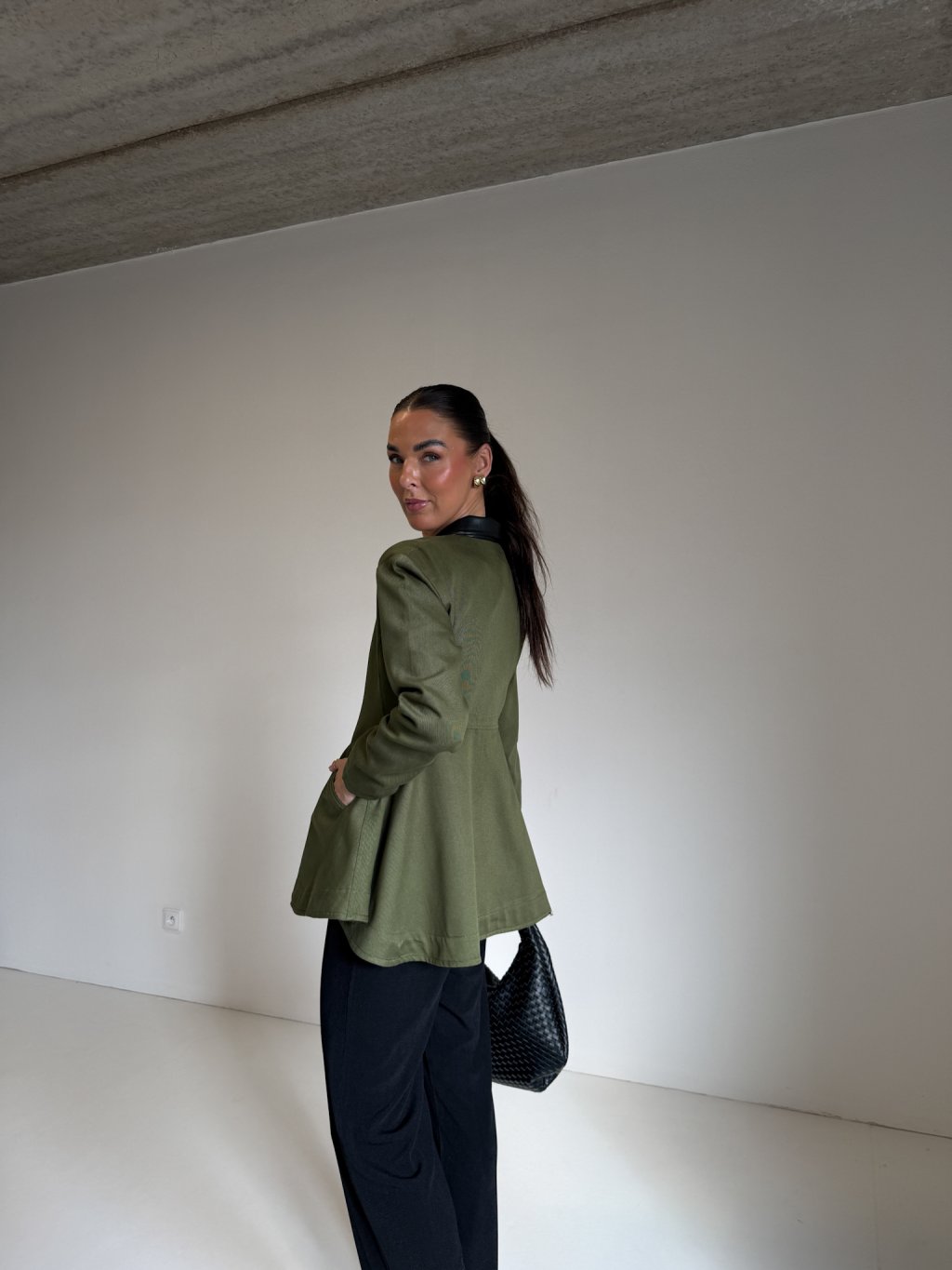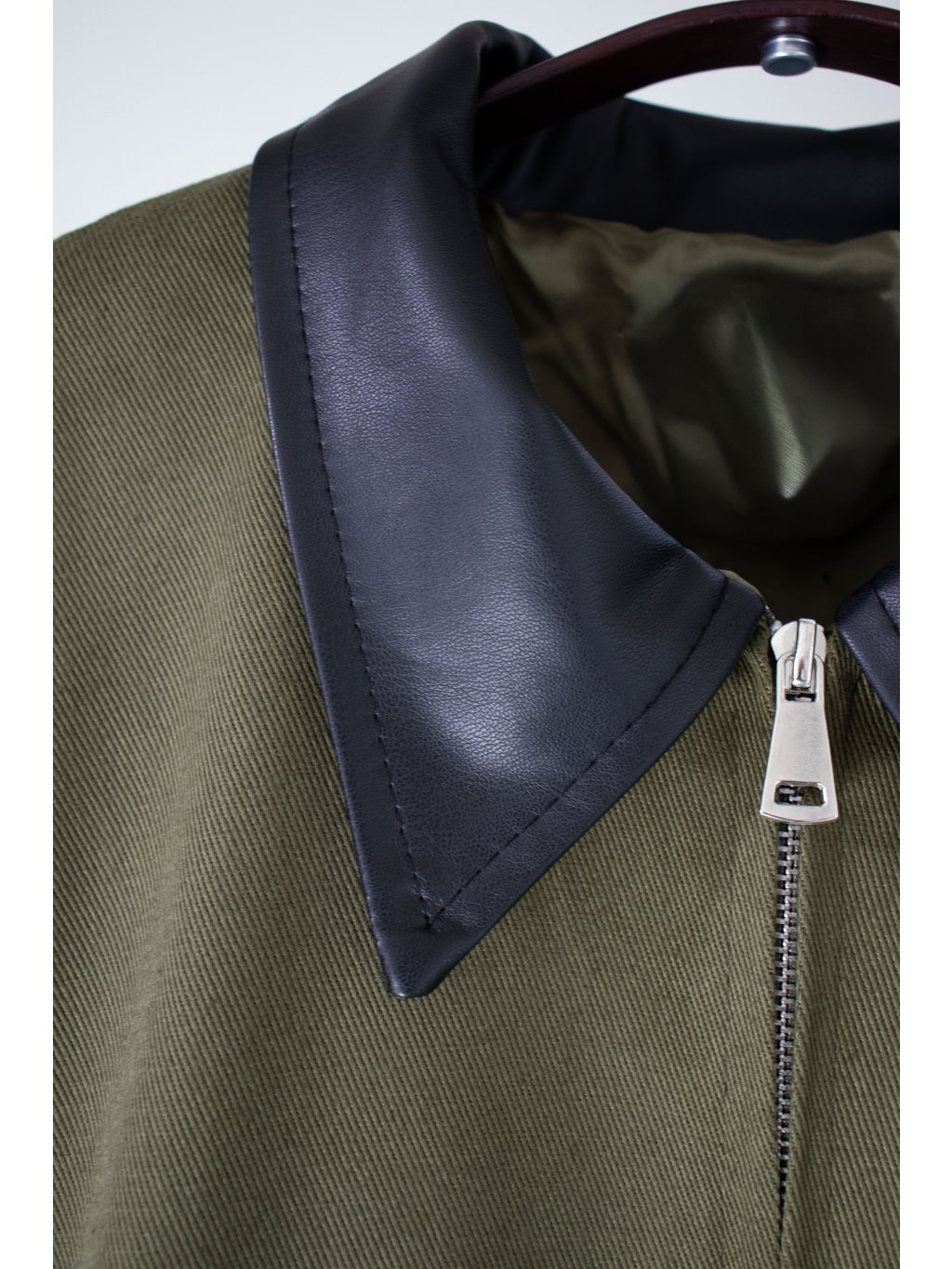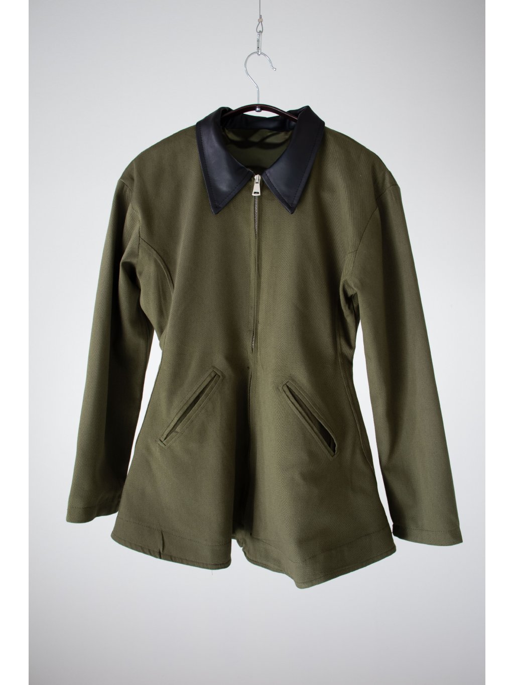 Vypasovaný kabátek s koženkovým límečkem, dlouhý rukáv, spodní část kabátku se rozšiřuje. Zapínání na zip ve stříbrné barvě, přední kapsy, délka do půli stehen, podšívka.