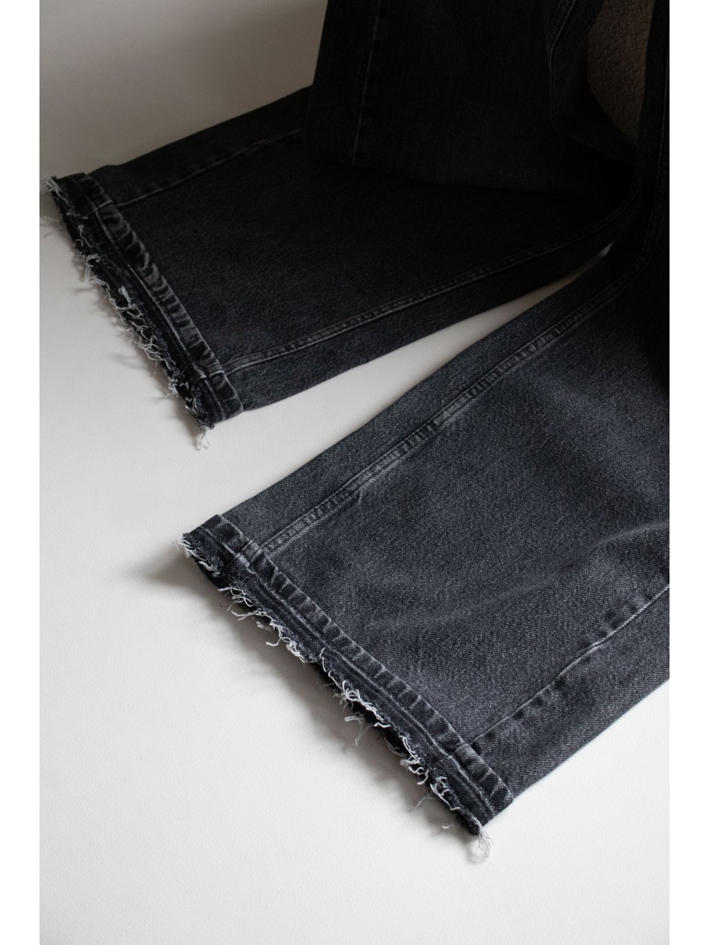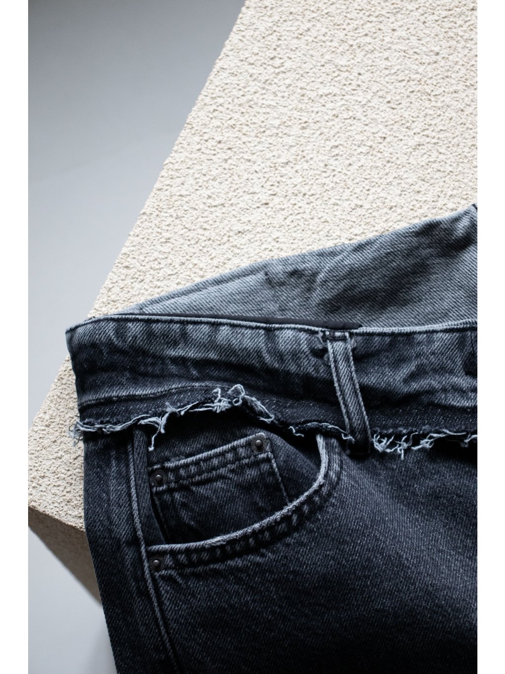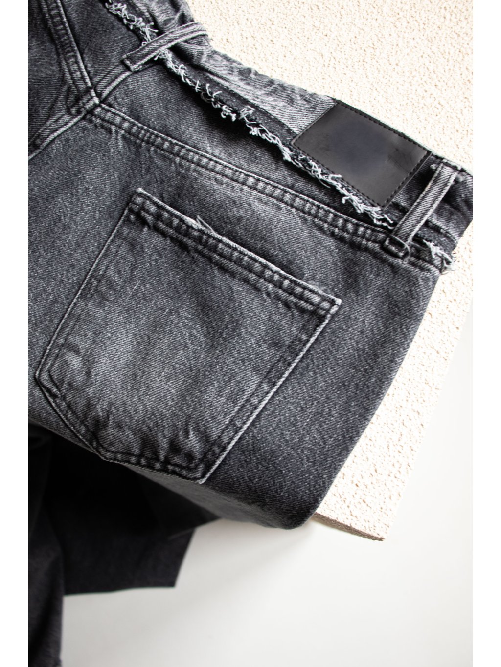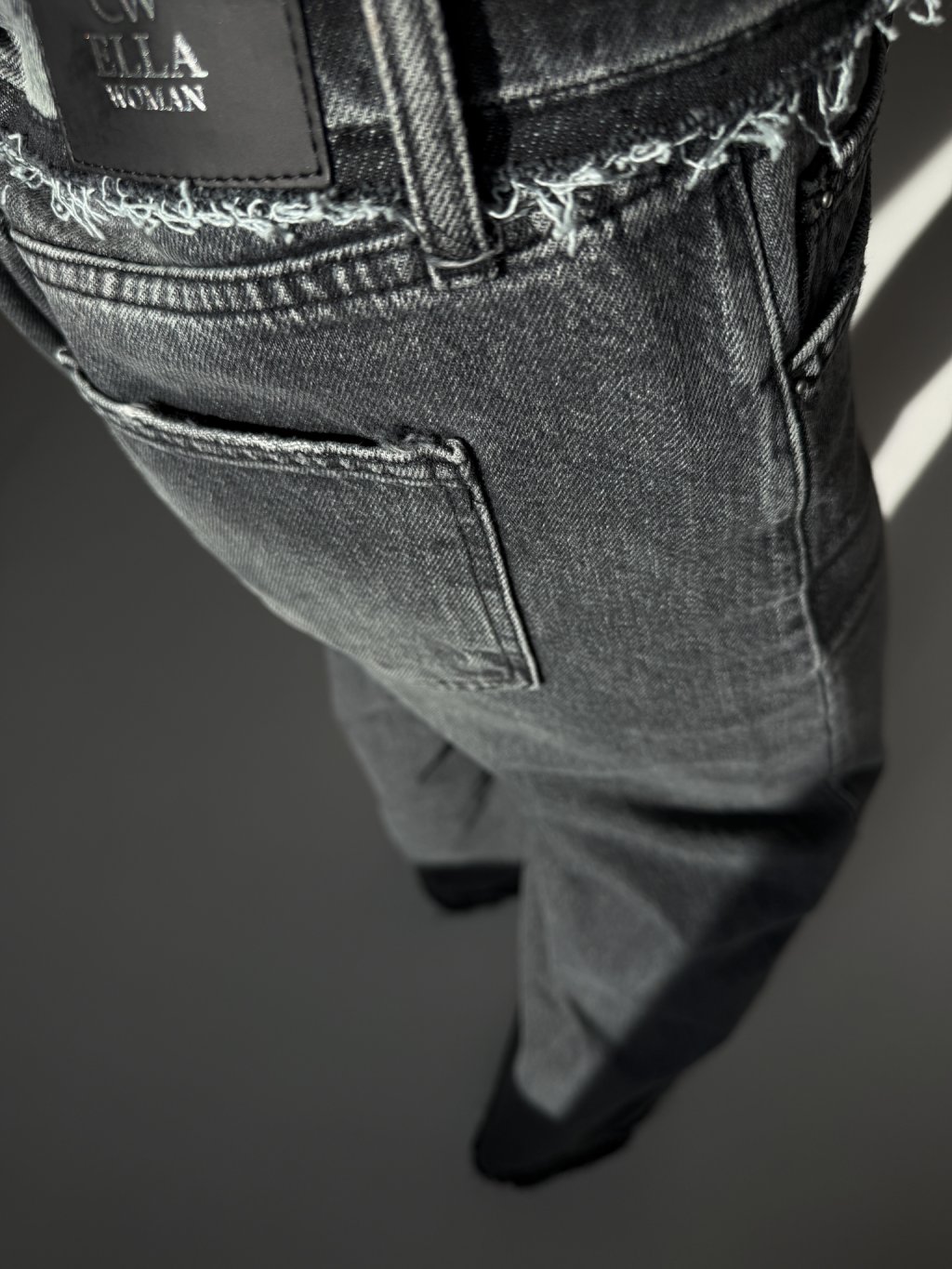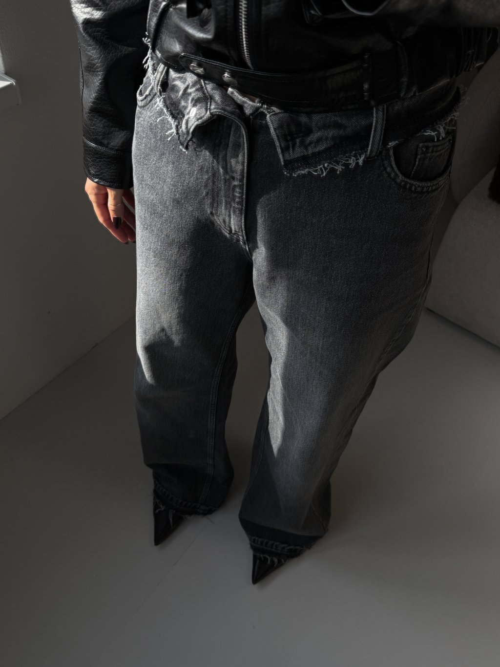 Šisované tmavě šedé džíny, které mají ohnutý pas s trháním.