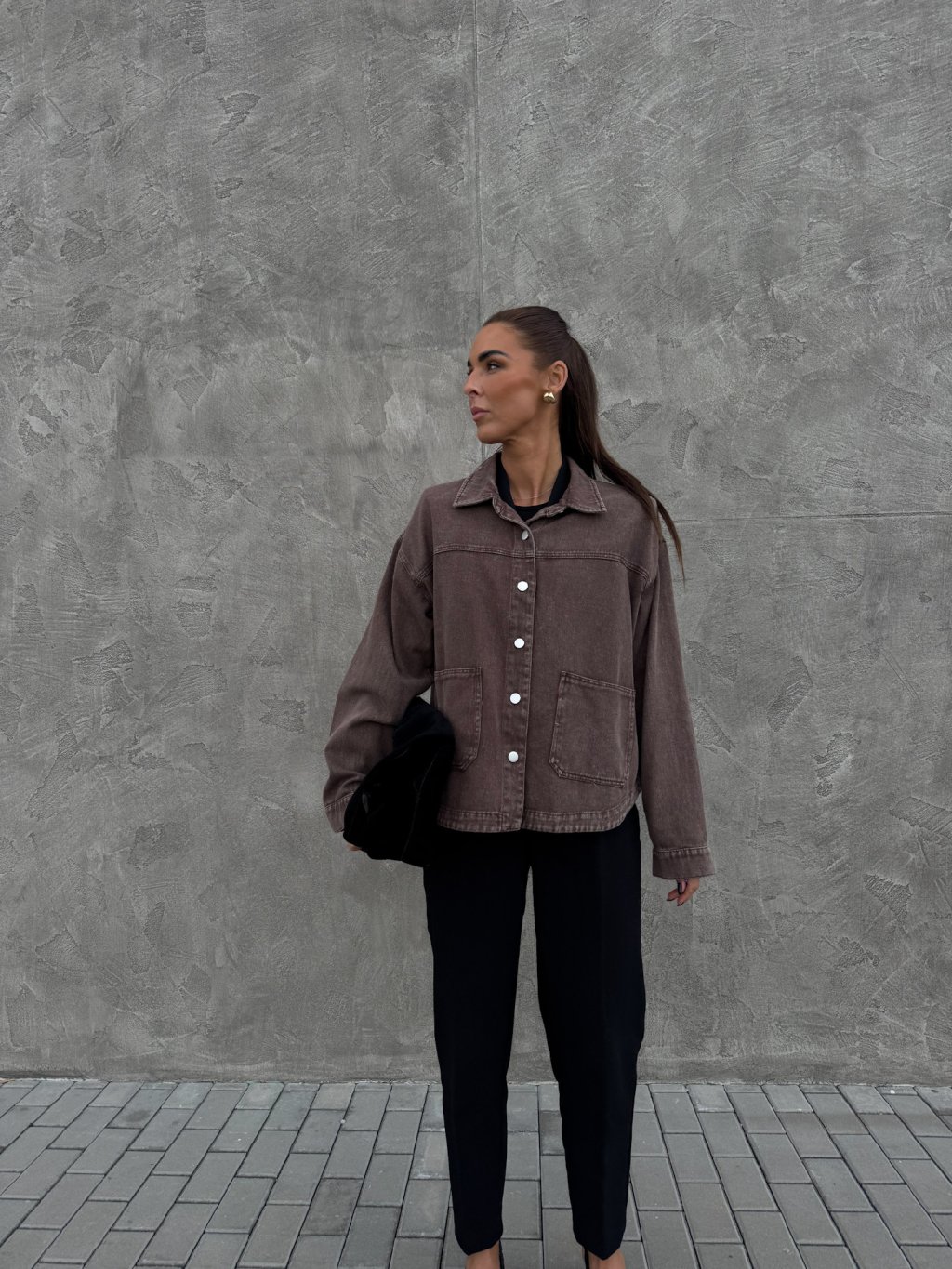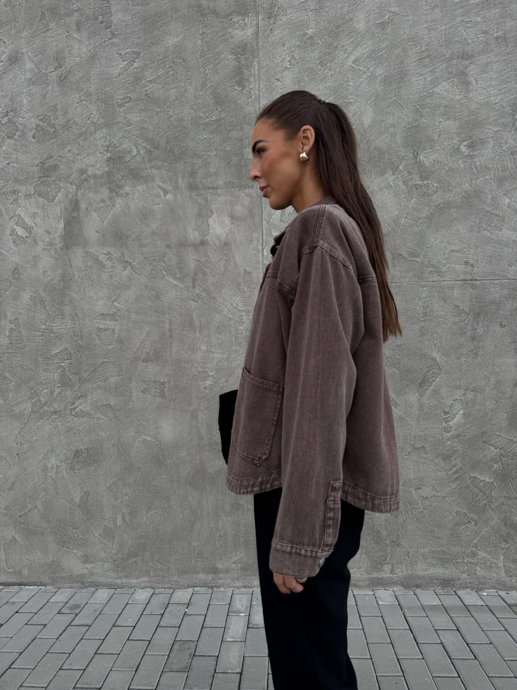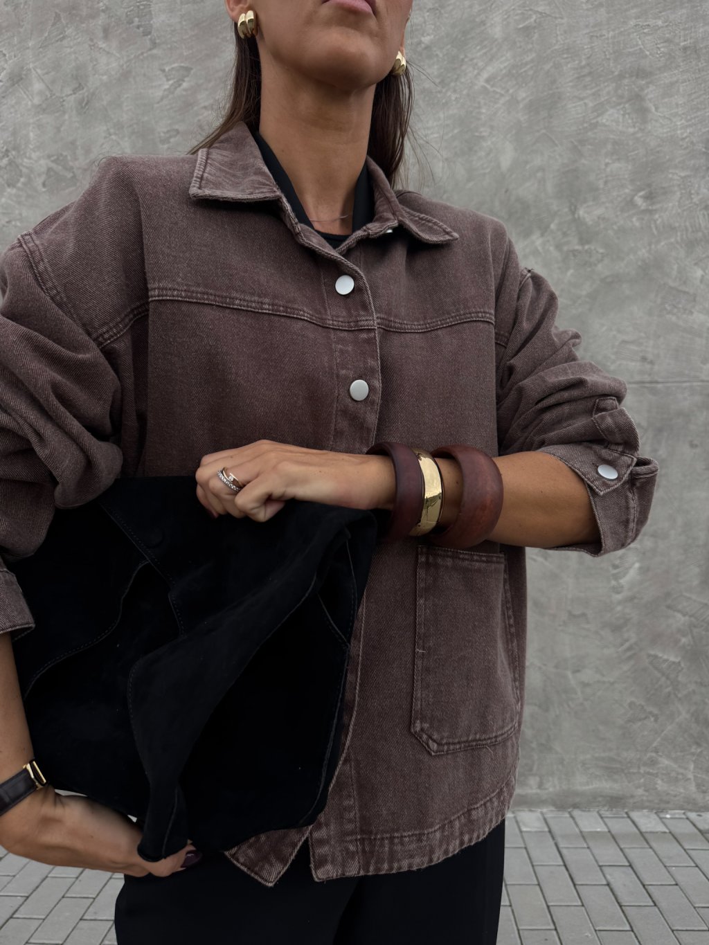 Košile s dlouhým rukávem, širší střih, vpředu velké kapsy, zapínání na denim knoflík ve stříbrné barvě. Na zádech detail s rozparkem.