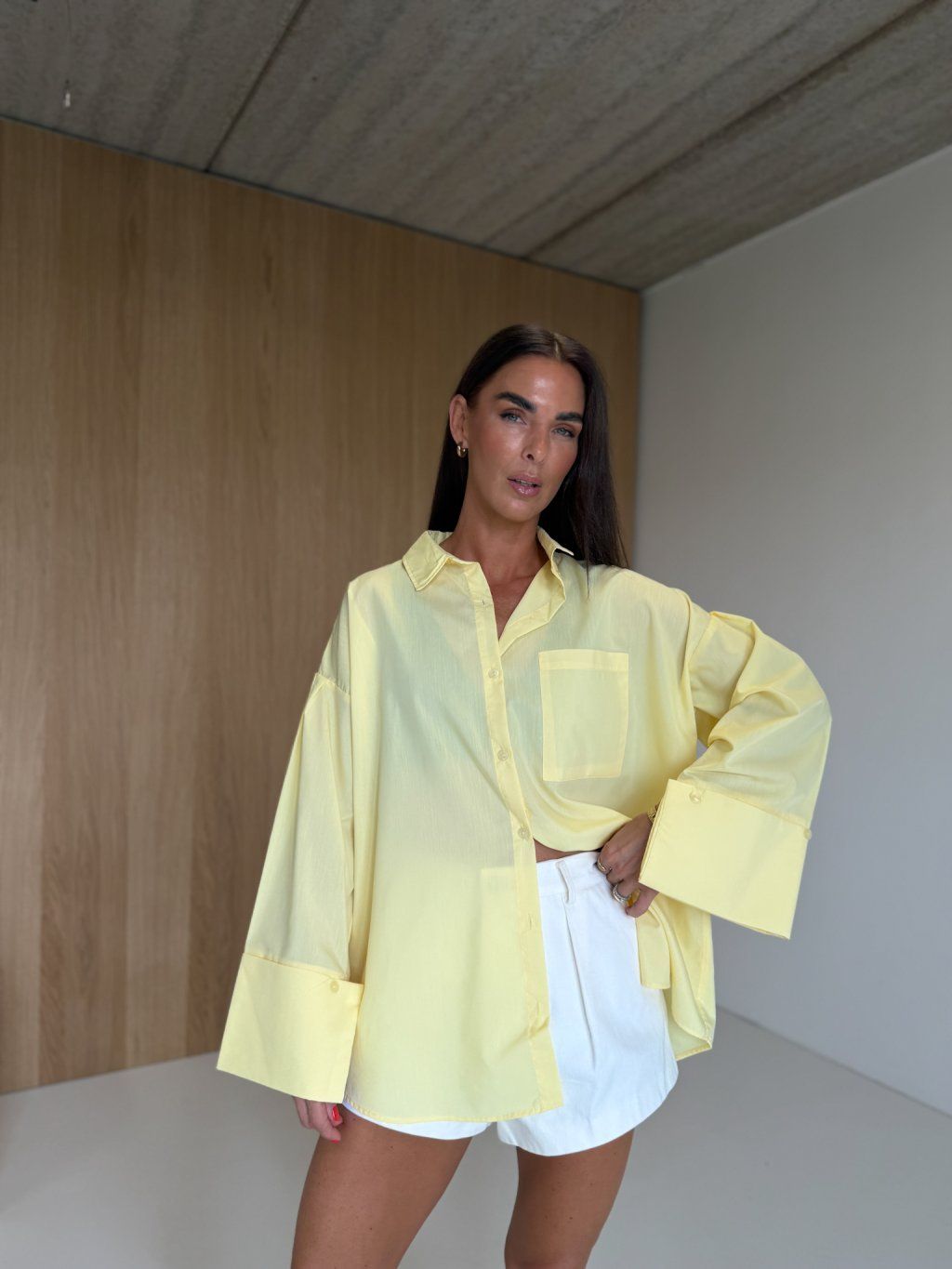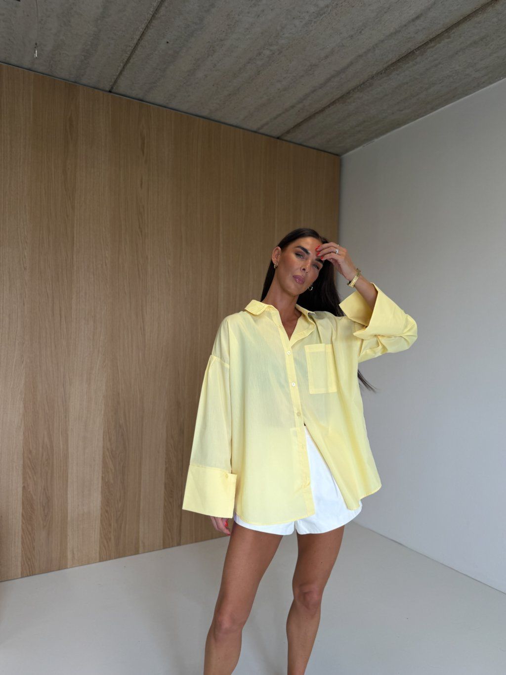 Košile oversized střihu, prodloužená délka, límeček, delší zadní díl, široké volné manžety, na hrudi jedna kapsa.